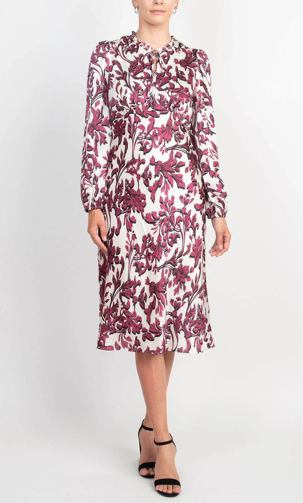Strut your stuff in this head-turning piece by Adrianna Papell AP1D104268. Showcases a split V-neckline with a self-tie making it look more elegant. This floral printed dress is tailored from matte satin fabric. Framed with long sleeves and paired with a fully enclosed back that is secured with a back zipper closure. The skirt in this winning piece has a sheath silhouette and flares to a knee-length hemline. Get noticed in any crowd wearing this Adrianna Papell AP1D104268 creation. Model is wearing Burgundy White color.