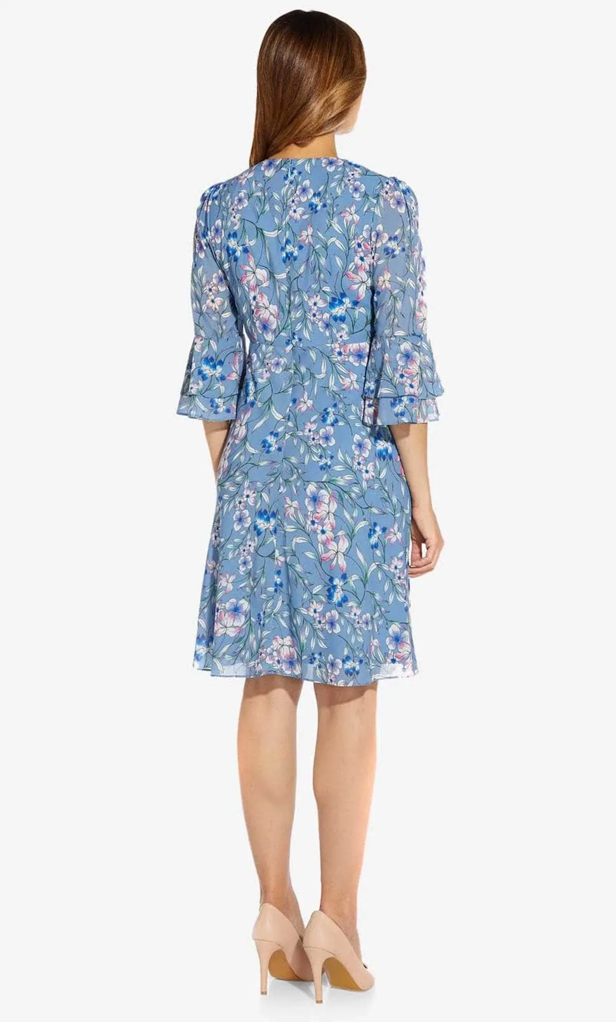 Lavish in the fascinating romance and beauty of this Adrianna Papell AP1D104622 creation. Styled with tailoring lines with vibrant floral details on a chiffon fabric, this dress features a v-neckline with quarter styled bell sleeves. Detailed with a full back and a zipper closure, the bodice is accented with an empire design. The skirt flares into an A-line silhouette with a knee length hemline. Glow with romantic opulence when you don this Adrianna Papell masterpiece. Models are wearing the Black Multi and Blue Multi colors.