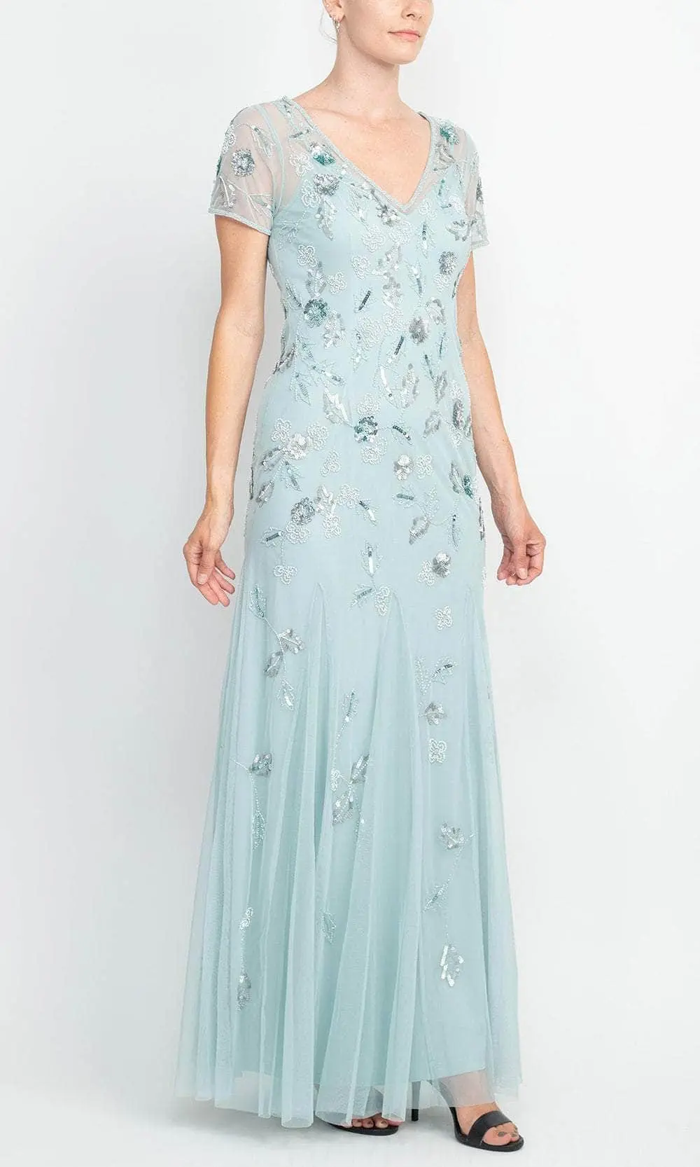 Walk in glamour and let all heads turn on you in this creation by Adrianna Papell AP1E209044. Adorned with gleaming sequins and beadwork that adds sparkle to this beautiful gown. This style features a sheer v-neckline, short sleeves and a partial sheer full fastened by a center zipper. The full length skirt flares in a stunning mermaid silhouette, accented with tulle pleated godets. Fall in love when you slip on this Adrianna Papell AP1E209044 gown. Model is wearing the Aqua Dust color.