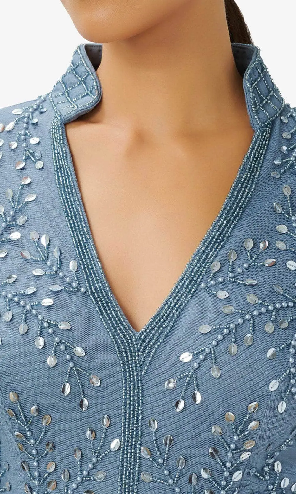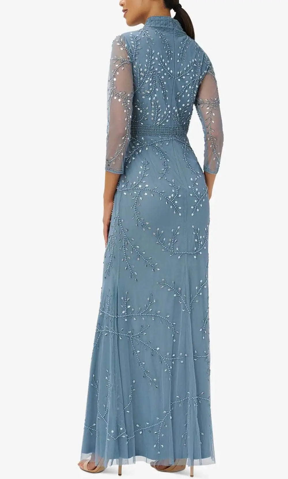 Get noticed in any crowd wearing this Adrianna Papell AP1E209946 P creation. This elegant gown is fascinatingly detailed with all-over beadwork and jeweled that gives a perfect amount of radiant sparkle. It features a deep v-neckline with a collared detail and sheer quarter-length sleeves. Capturing a full style back with invisible zipper closure, the full length A-line skirt parts with a front slit for ease of movement. Shine with the glow of ever after in this mesmerizingly Adrianna Papell AP1E209946 P evening gown. Model is wearing the Vintage Blue color.