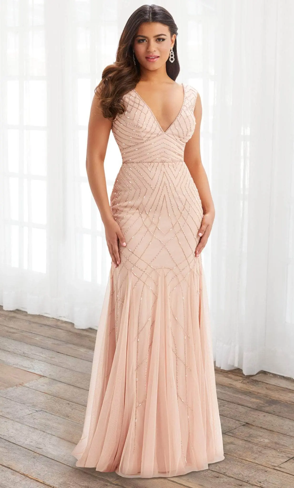 Make a memorable splash at your upscale evening in this lux formal gown by House of Wu 40392. Sparkle amongst the crown with the beaded embellishments that cover this full length gown in geometric patterns. A plunging V-neckline tapers into sleeveless shoulder straps, while the beaded patterns accentuate the curves. This dress clings to the figure, and flows out in a fit and flare style. Expect to be turning heads as you walk into your special event wearing this creatively romantic creation by House of Wu 40392. Models is wearing Blush color.