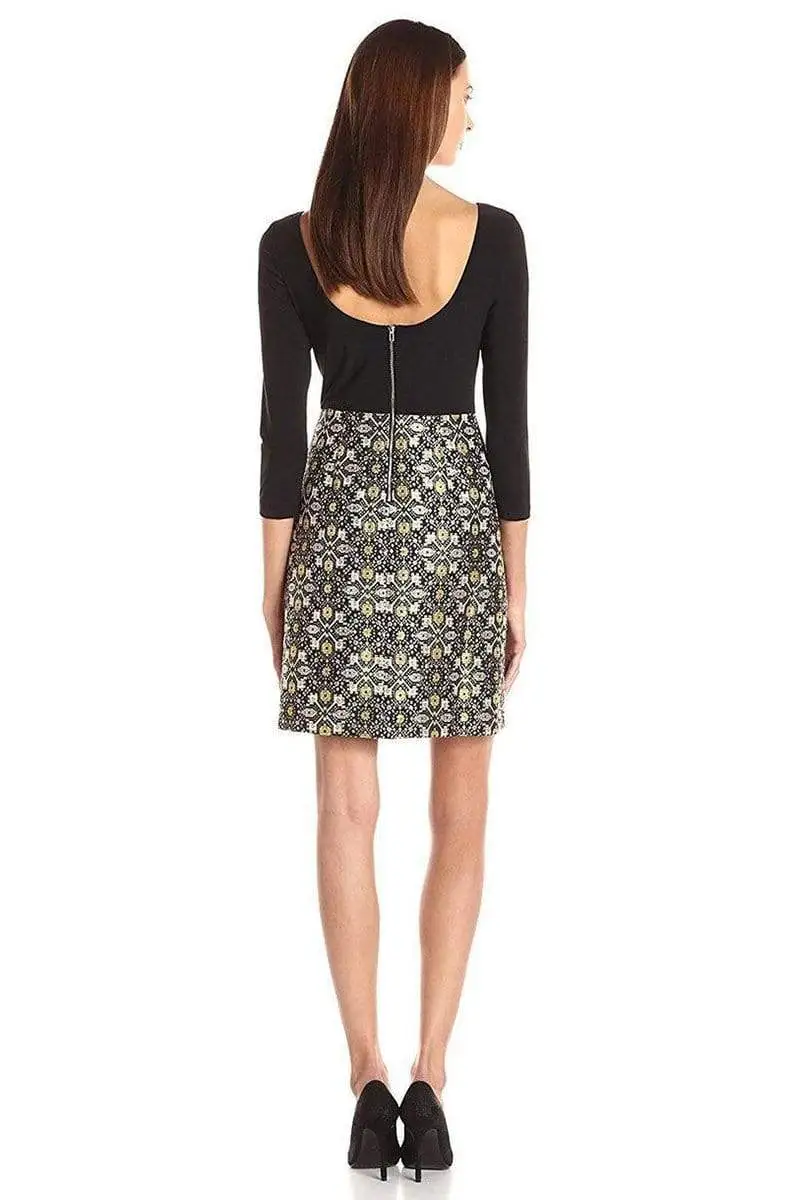 | Details: | Bateau Neck, Quarter Length Sleeves, Metallic Jacquard, Printed Skirt, Scoop Back, Back Zipper |