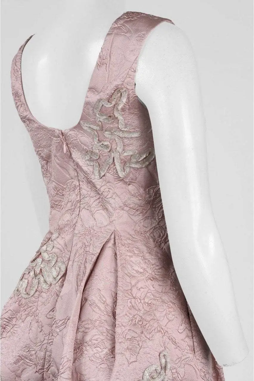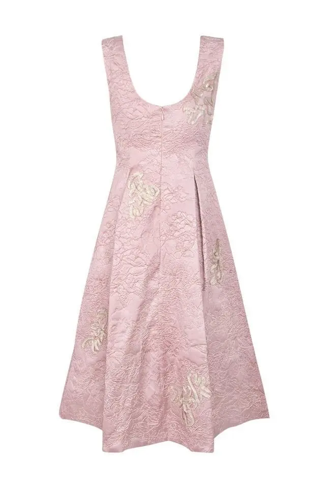 This tea-length dress is designed with floral appliques embedded on jacquard fabric. The bodice is sleeveless with bateau neckline and scoop-shaped back. The skirt with in seam pockets flares in an A-line style.
