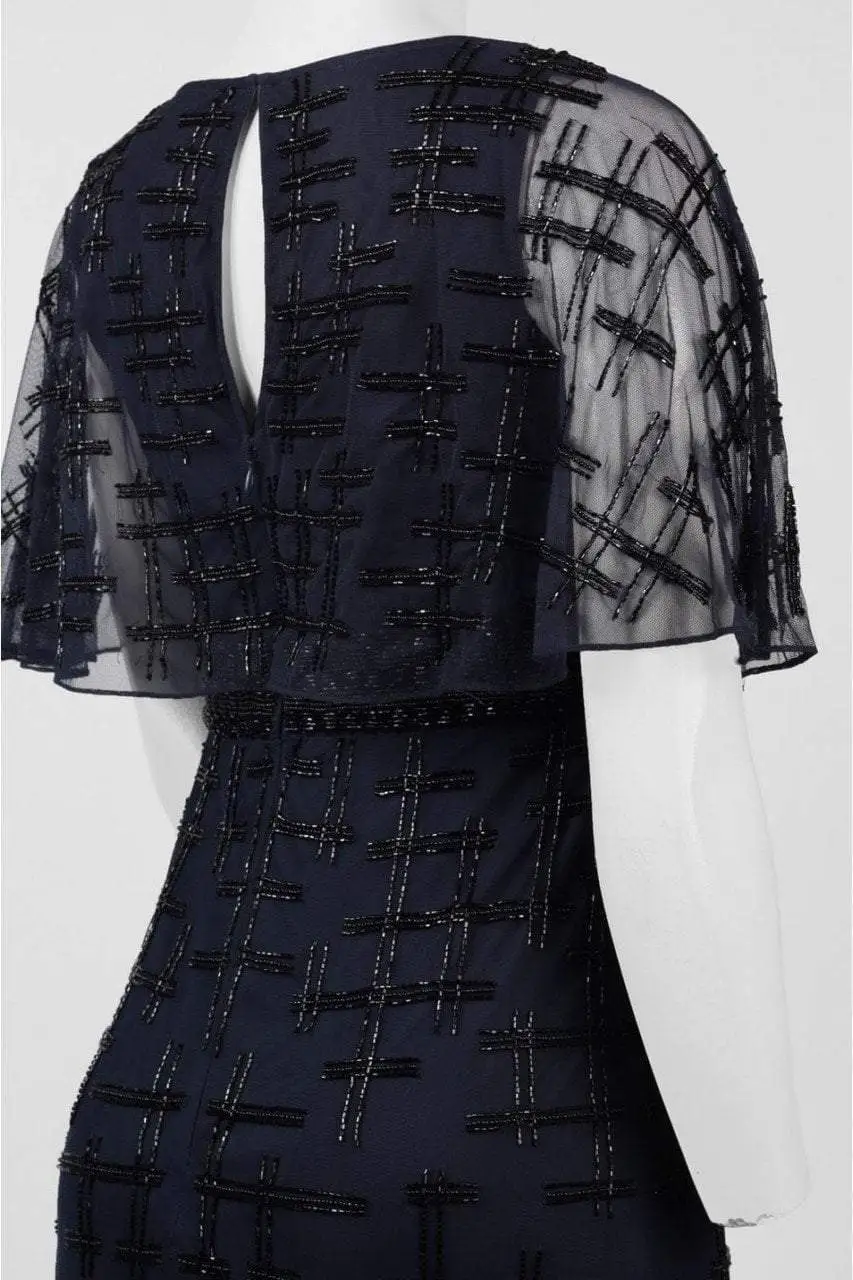 | Details: | Short Flutter Sleeves, Keyhole Cutout Back, Back Zipper Closure, Capelet Accent, Lattice Beadwork, Wide Beaded Bands, Mesh, Full Length Hem |