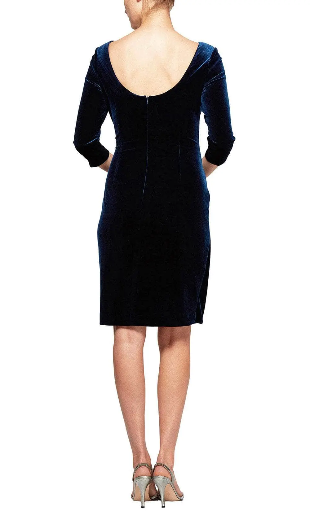 Glide into a room and be the focus of everyone’s attention in this gorgeous Alex Evenings 1915268 creation. Beautifully cascading with soft draping on a rich velvet-like silhouette, this stunner parades a scoop neckline and framed with quarter sleeves. Designed with a deep scoop back and accented with a beaded brooch along the waist, the sheath skirt is dominated with a slit as it skims into an above the knee hem. Fancy a romantic night of celebration in this elegant Alex Evenings masterpiece. Models are wearing the Imperial, Forest and Wine colors.