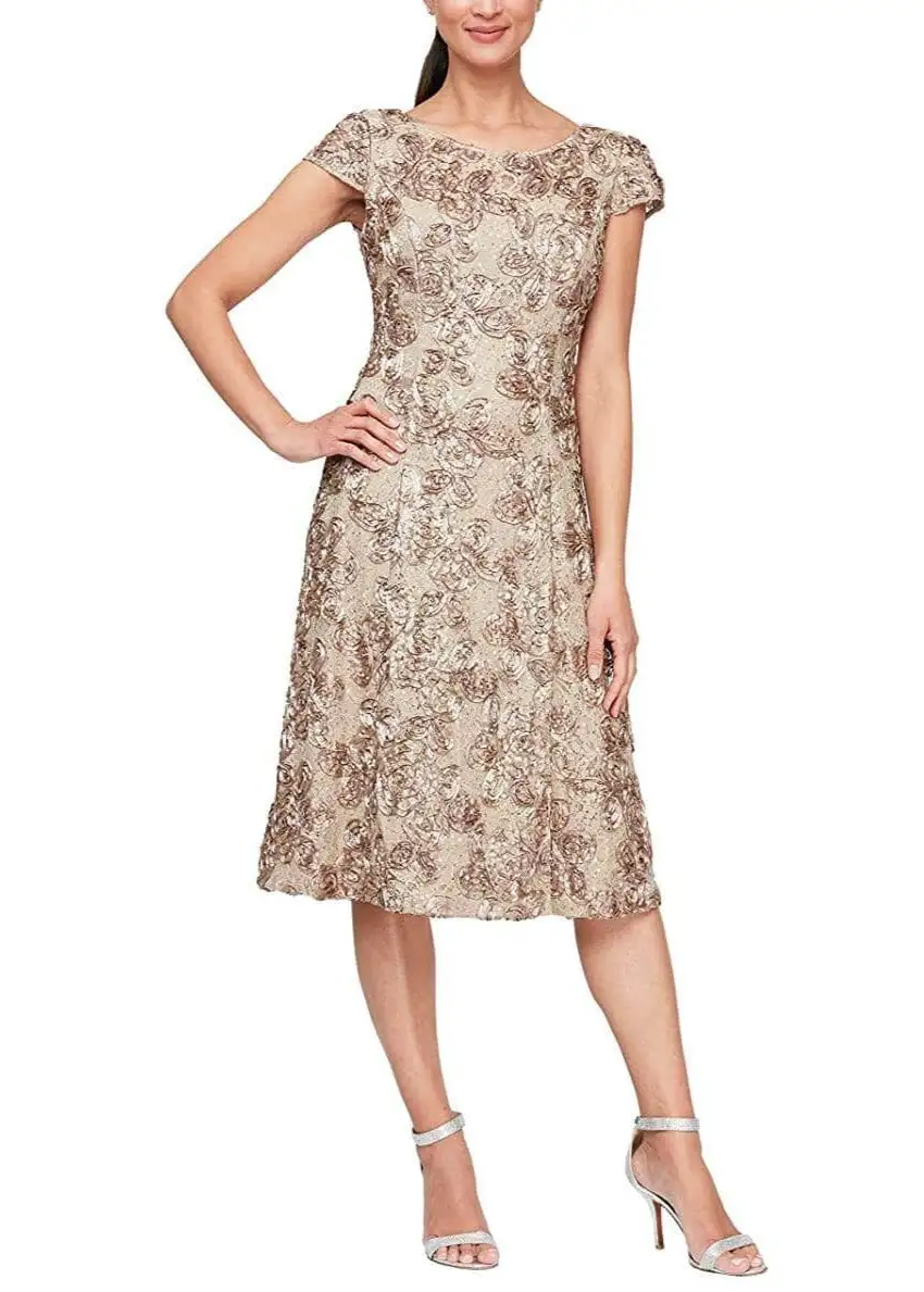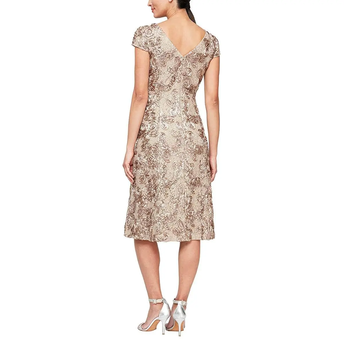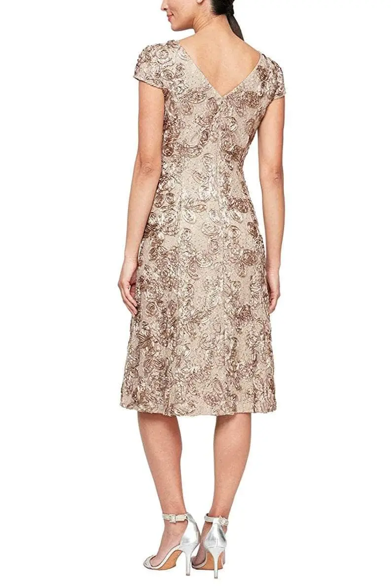 Shine through the night in this mesmerizing Alex Evenings 2121570. Detailed with intricate sequins patterned in stunning rosettes, this dress flaunts a bateau and cap sleeves. The skirt reveals an A-line silhouette that runs at the tea-length hem, while the back highlights a V-shaped cut with a center zipper closure to complete the look. This Alex Evenings style will make sure you turn heads all night long. Dress is pictured in Brushed Periwinkle, Navy, Dove, Rose and Champagne colors.