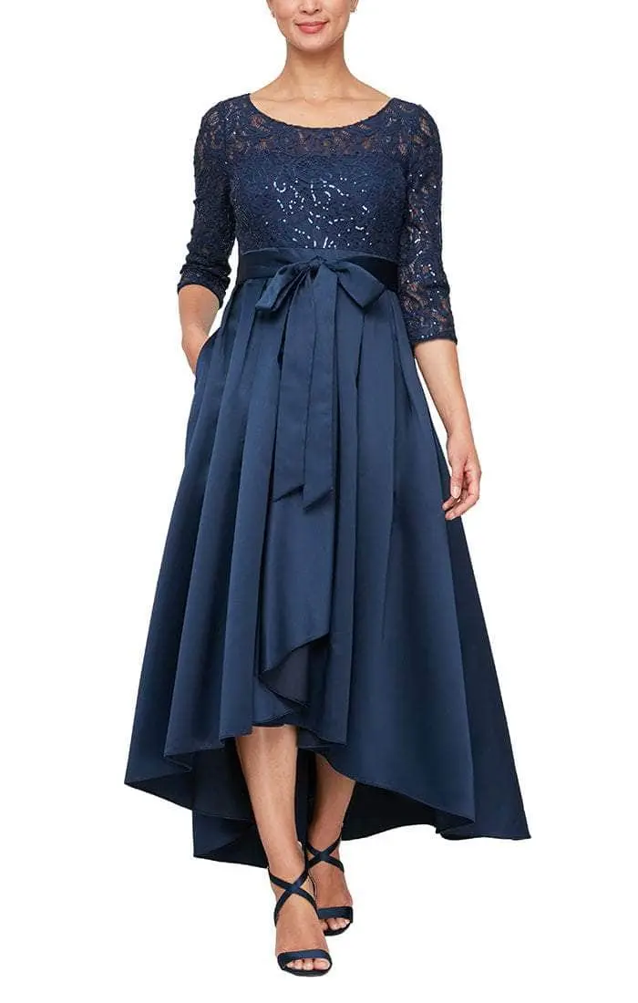 Be the loveliest of them all wearing Alex Evenings 81122468 creation. This dress is designed with sequin lace details to highlight the illusion jewel neckline and quarter sleeve. The A-line skirt flows down to a high low hem with pleated details all the way at the back. The waist is accented with a ribbon tie while the full back has a center zipper closure to complete the look. Be the ultimate belle of the party in this gorgeous high-low dress from Alex Evenings.