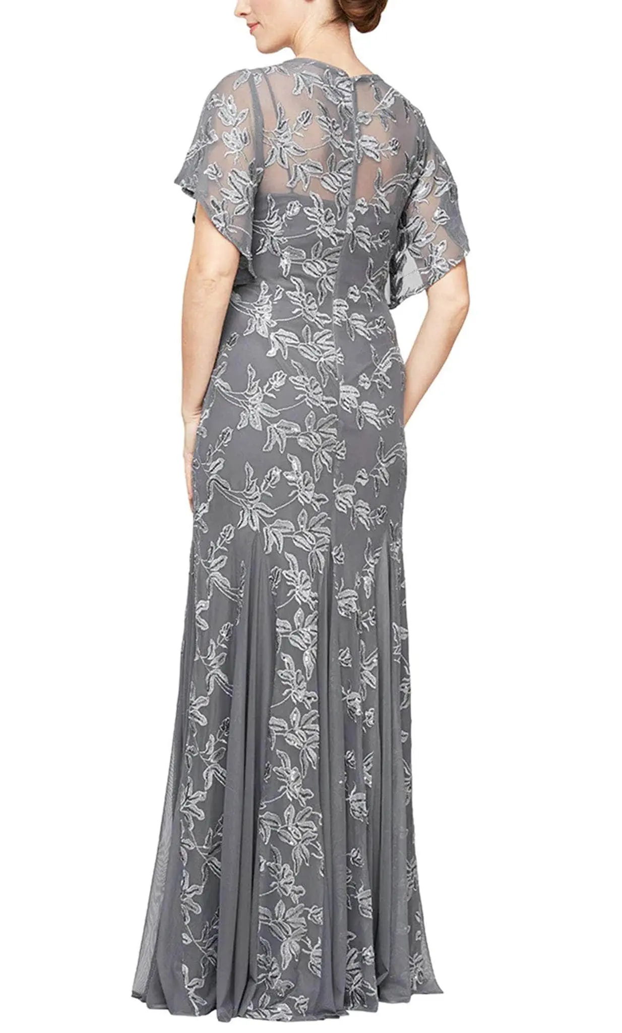 Get glamorous underneath the modern and classic detailing on the A-line silhouette of Alex Evenings 81171216. This sophisticated gown parades an A-line silhouette and walks with a romantic sweep train as it reaches the floor length. Fashions a sheer flutter sleeve on a bodice cut in V neckline. Detailed allover with floral embroidery and then closed up with bac zipper for security. Exhibit your softer side in this delightful evening gown by Alex Evenings 81171216. Model is wearing Smoke color.
