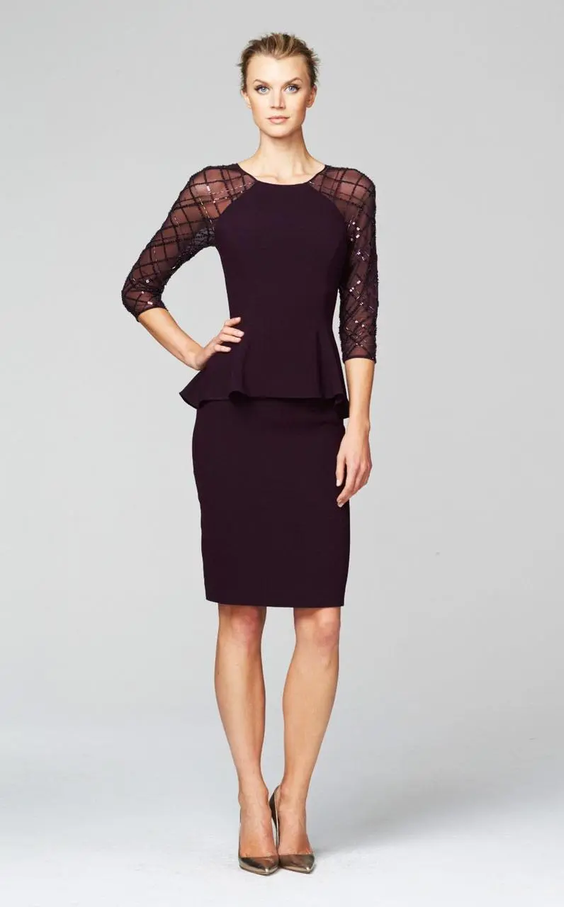 The jewel neckline bodice has sheer elbow-length sleeves with sparkling sequin embellishments in a gorgeous lattice pattern. A peplum accents the waist as this lovely ensemble flows to the knee-length hemline.