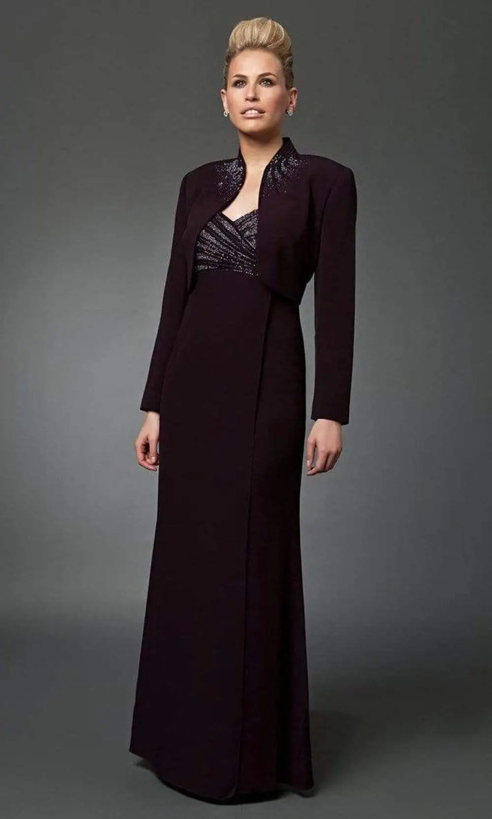 Look fantastic for your next formal event in this dress by Alexander by Daymor 3112. This ensemble brandishes in a sleeveless, V-neckline with fitted bodice ornate with bead embellishments. From the empire waist flourishes a full length sheath skirt. Complimenting the look includes a beaded long sleeve bolero. Get noticed in this radiant look from Alexander by Daymor.