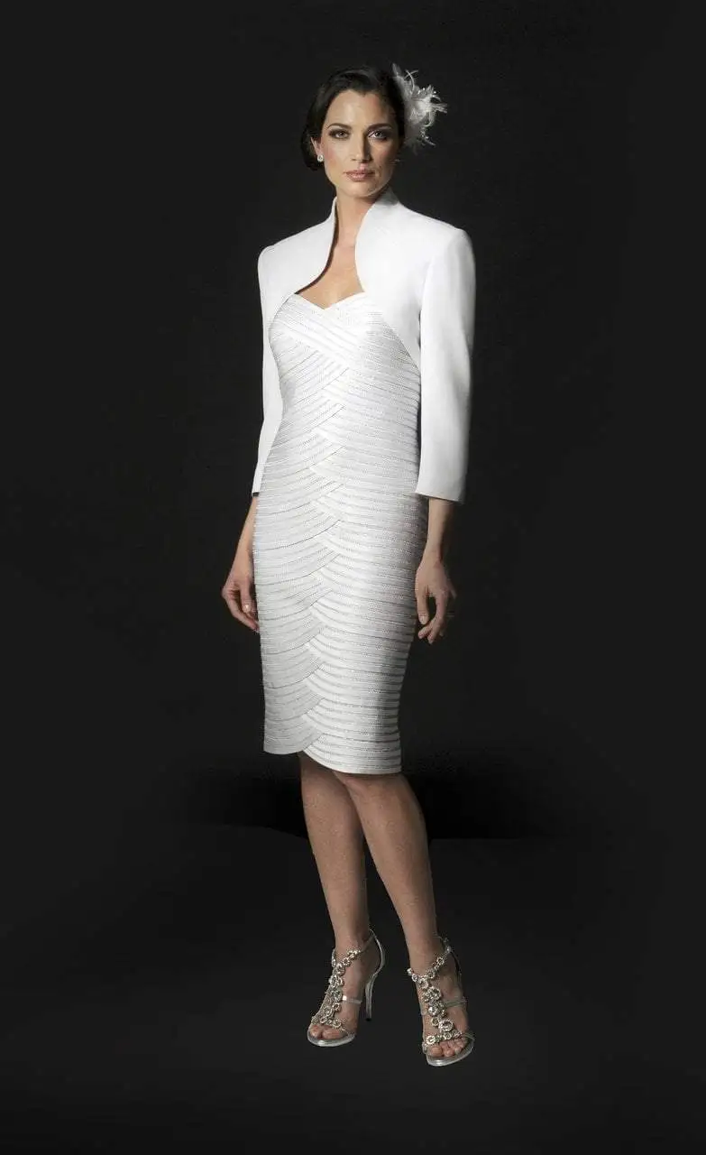 Let everyone share your penchant for the classy and alluring in this riveting Alexander by Daymor 1019 creation. Fascinatingly sculpting, this elegant ensemble showcases a unique weave-like fabric that is intricately sewn back and forth from neckline to hem while being interspersed with metallic threads for that added touch of sparkle. While flaunting that stylish interspersed design, this piece showcases a strapless sweetheart neckline as well as a sculpting knee-length sheath silhouette. A quarter sleeve bolero with a trendy high collar presents a cutaway treatment that spices up this amazingly put together ensemble. Flaunt high class taste in this glamorous Alexander by Daymor masterpiece. Model is wearing the Black and Teal Blue colors.