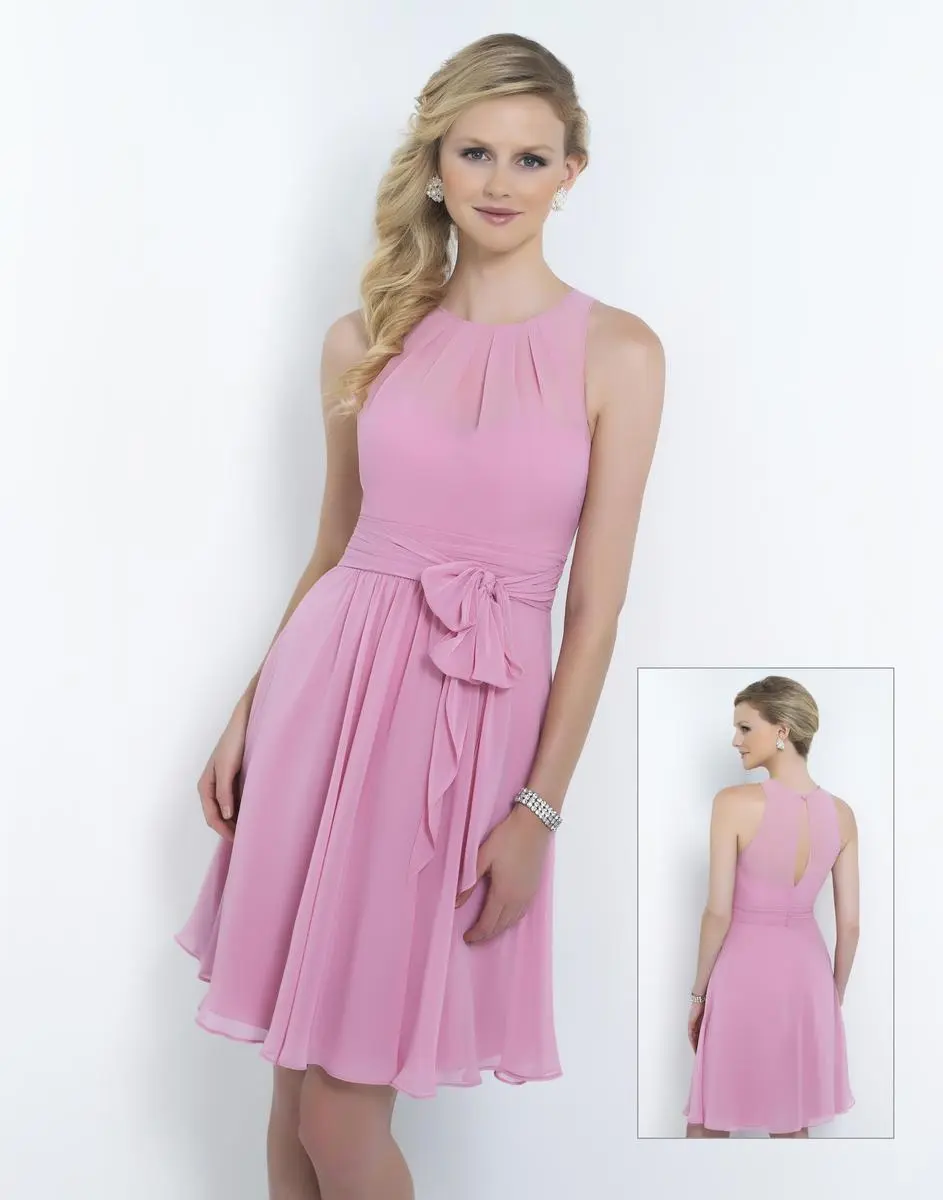 Get a timeless and trendy look in a new dress from Alexia Designs 4204. This chiffon dress glams in a sleeveless, halter neckline with pleated waistband styled with a bow. The skirt opens in a flowy A-line silhouette and runs at mid-thigh hem. Claim that look of sophistication wearing this glamorous dress by Alexia Designs. Model represents the dress in Pink color.