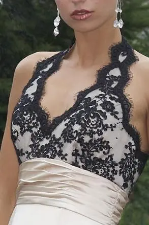Flaunt your figure in this fabulous dress by Alexia Designs 830. Features a sleeveless, scalloped halter V-neckline with bodice made of lace appliques and eyelash trim. The waist is wrapped in a ruched waistband and flourishes a satin trumpet skirt in full length hem. Be a vamp in an alluring dress from Alexia Designs. Model is wearing Cream/Black color.