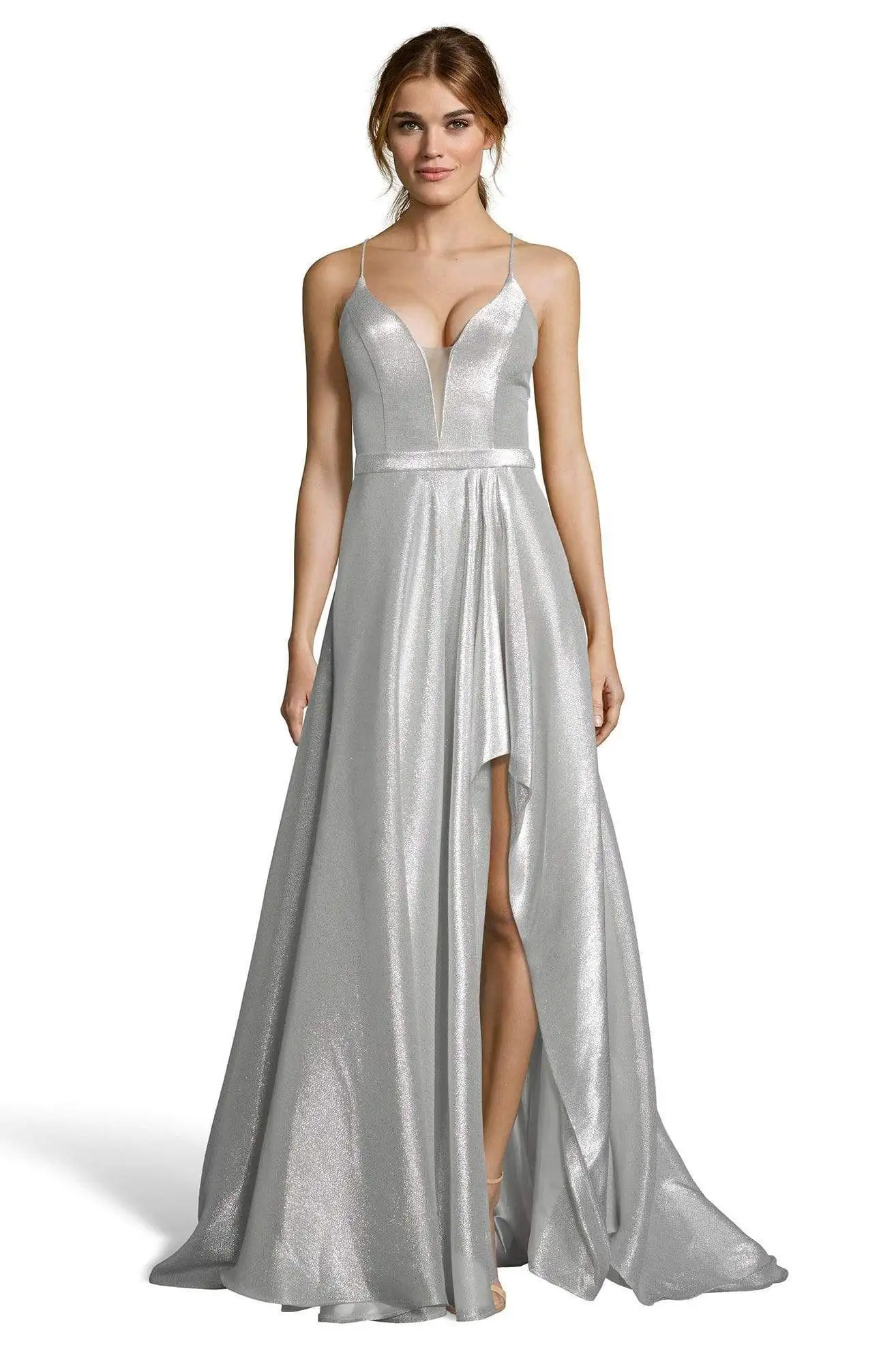 Look brilliantly stunning at this years Prom with this Alyce Paris 60712 masterpiece. Showcasing a high-low hem, this strikingly stylish gown is crafted in shimmering metallic lame fabric with a fitted bodice flaunting a deep V neckline with sheer inset for an illusion plunging effect. The open back features lace-up closure for an adjustable fit and support to the bodice followed by an invisible center zipper closure. The skirt flares an A-line silhouette with its flowy asymmetrical hem to show those sexy legs. This Alyce Paris creation is splendidly captivating!