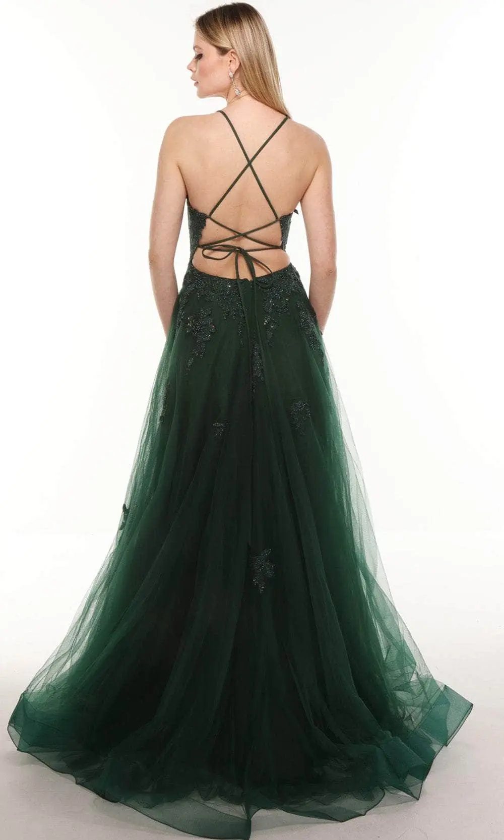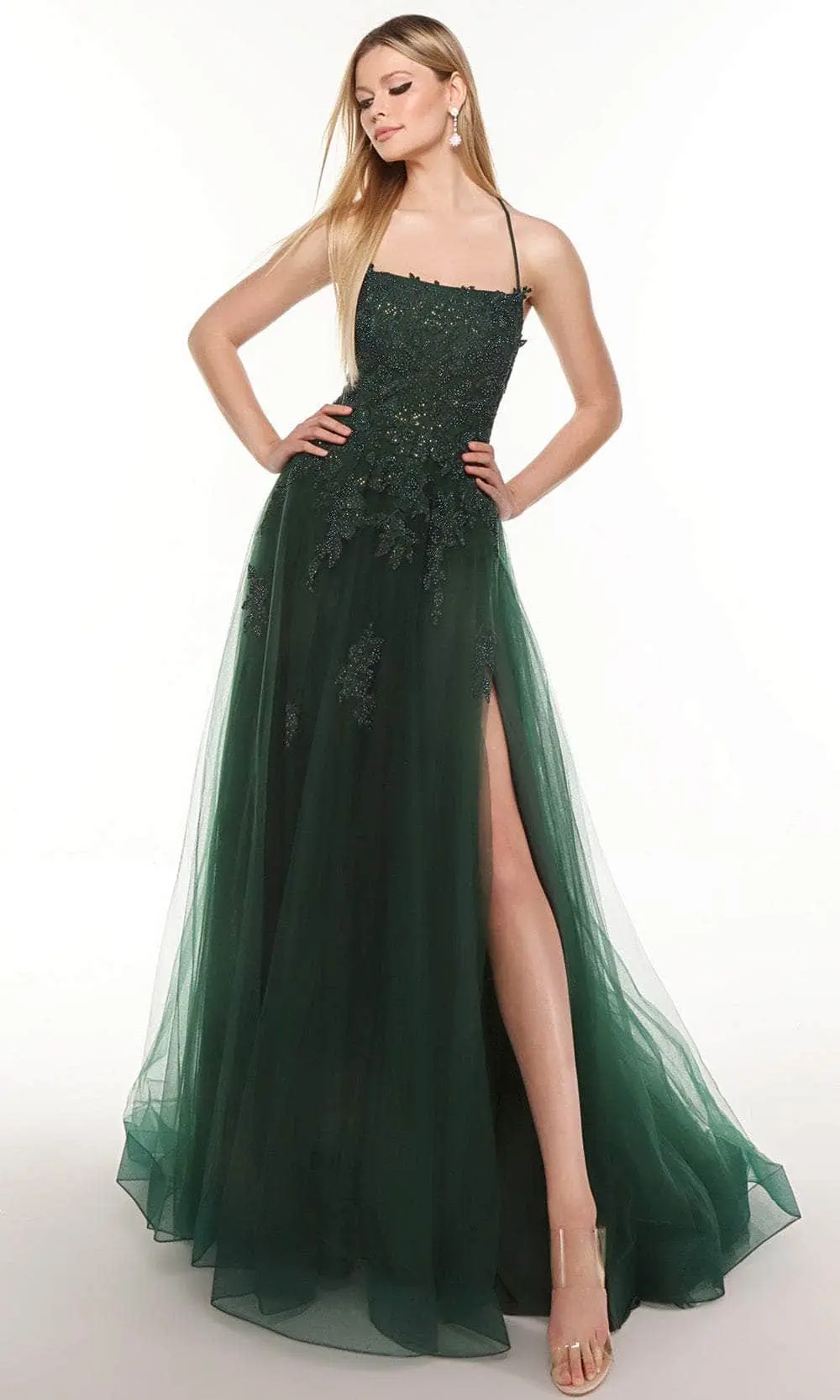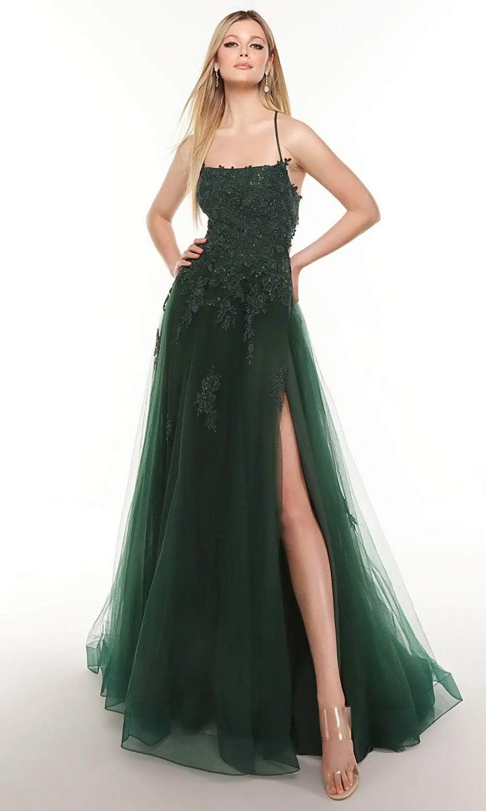 Channel your inner ballerina with this styling Prom Dress from Alyce Paris 61286. Whatever the dress code or dress style, we’ve got you prepared for Prom Night with this semi ballgown. Features a straight neckline with thin straps that cross at the back revealing an open sexy style. Floral and leaf motif adorns the bodice as it offer a little shimmer with its beads and stones. The skirt dazzles in layers of tulle as it shows your sexy legs with its high slit and leave you a train finish. Dance the night away with this Alyce Paris creation. Model is wearing the Pine color.