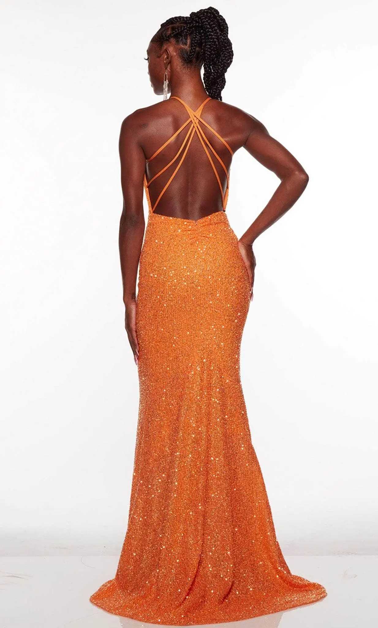 Create a special moment in this enchanting Alyce Paris 61396 creation. Shine like a star all night in this figure-flattering gown covered in sequins. This sleeveless piece boasts a deep v-neckline, thin shoulder straps and a backless style with strappy detailing. It also consists of ruching along the zipper closure. The skirt gorgeously cascades in a full length sheath silhouette with a sweeping train from behind. You are statuesque in a posed gown from Alyce Paris 61396. Models are wearing the Blossom, Cantaloupe, Light Blue and Unicorn (Violet) colors.