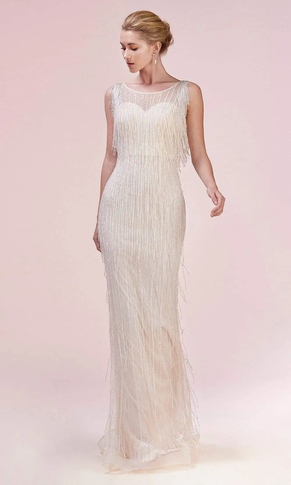 Exhibit a dynamic flair in this impressive Andrea and Leo A0521 creation. Streaming with bead-fringes texturizing the fitted silhouette, this beauty has a sheer bateau neckline paired with a translucent back. the fluttering skirt traverse to the floor with a train. Imbibe pure sophistication in this Andrea and Leo masterpiece.