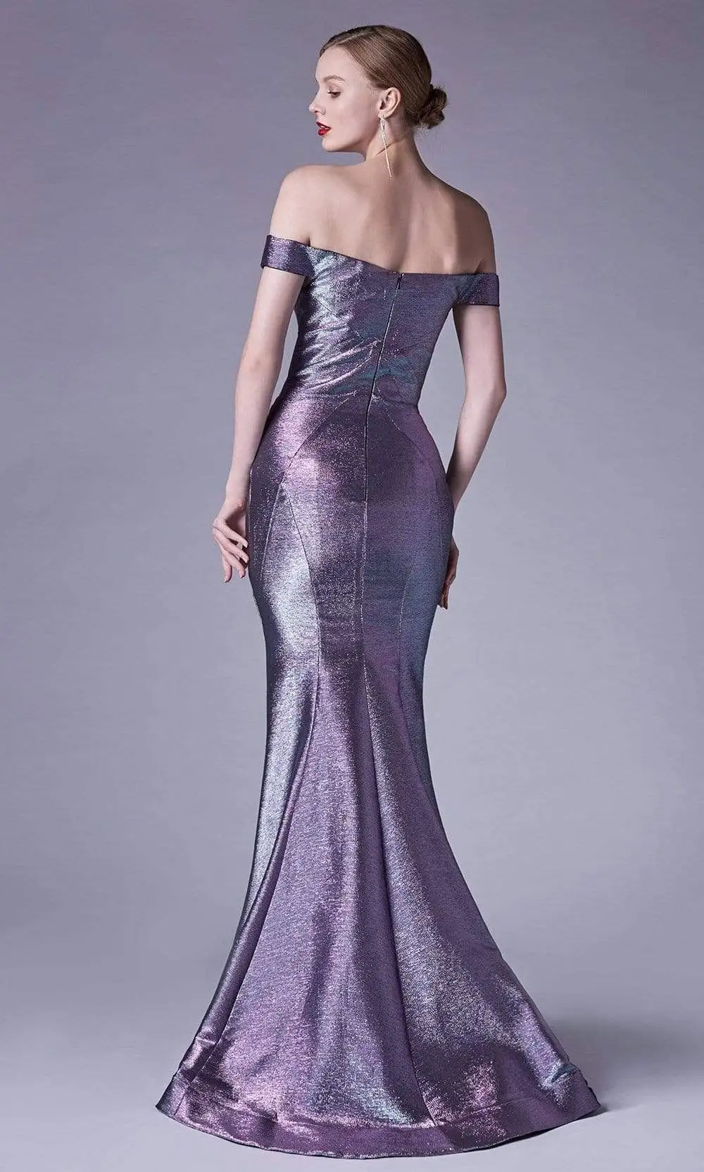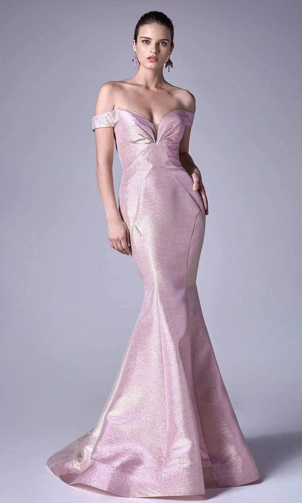 This iridescent metallic jacquard dress flourishes an off shoulder sweetheart neckline with a pleated bust and sheer inset panel. It has a form-fitting bodice and a mermaid skirt styled with a sweep train while the back highlights a mid-open cut and zipper closure to complete the look. Dress is pictured in Opal Blue, Opal Pink and Opal Silver. colors.