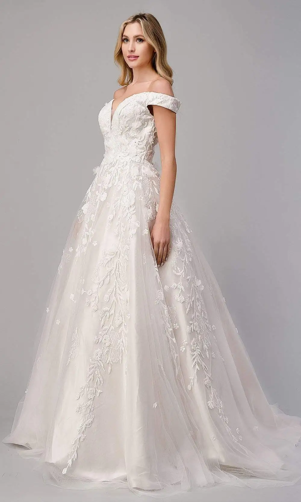Take your seat on the throne in a queenly gown from Andrea & Leo A1027W. Walk in sophistication on your wedding day wearing this off shoulder sleeve dress that is embellished with embroidery. It uses tulle fabric in a voluminous A-line silhouette and runs with a chapel train for a walk in the aisle more memorable. Andrea & Leo making it well-suited for both petite and curvy brides who want a chic, classic look.