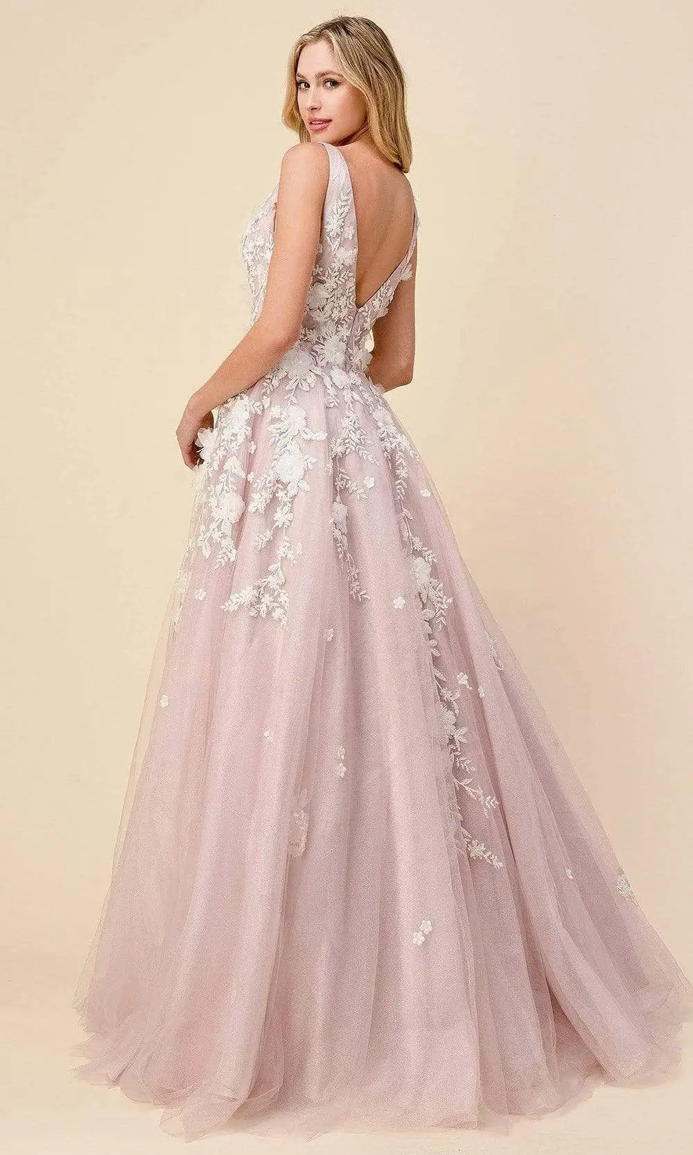 | Details: | Sleeveless, Plunging neckline, Sheer inset, Fitted bodice, Floral appliques, Ballgown skirt, Pearls, V-back, Back zipper |