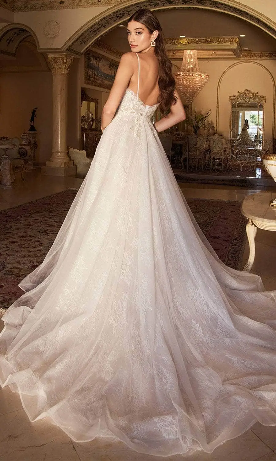 Entice everyone with a timeless flair on your special day in this luxe Andrea and Leo A1102W creation. Breathtakingly sculpted in a dainty Chantilly lace silhouette draped with tulle, this gown parades spaghetti straps trailing into a v-neckline with sheer trims. Defined with a sheer lace back and a zipper closure, embroidery ornate the bodice before trailing down to the lush skirt. The A-line skirt softly cascades to the floor with a stunning pool of train. Exude a charming sophistication that surpasses everyone in this Andrea and Leo masterpiece. Model is wearing the French White color.