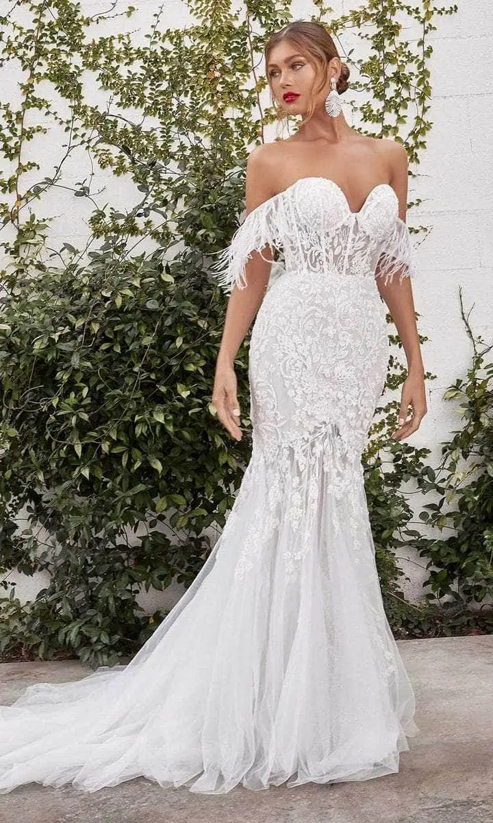 Featuring a gorgeous spectacle of foliage beadwork, this gown charms with a sheer corset bodice with a sweetheart neckline. Draping with feather ornate off shoulder sleeves, the mermaid skirt flares into a frothy court train. Model is wearing the French White color.