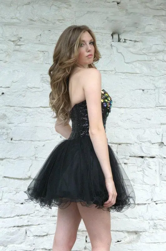 Transform into a social butterfly in an instant when you slip on this vibrantly crafted Angela and Alison 21064 creation. Designed with a spectacular blend of sequins and over-sized beaded accents that shimmer incandescently on the corset boned bodice, this stunner unveils a sweetheart neckline and paired with a mid-open back. Accented with a bodice that delves to create a regal Basque waist style, the tulle A-line skirt flares into a full ruffled design that layers down to finish with a curling mini-dress hemline. Twirl on the dance floor with pure grace in this Angela and Alison masterpiece.