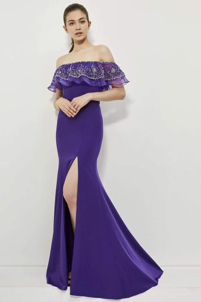 Be the center of attention in this glamorous evening gown by Angela and Alison 81135. The impressive formal gown features an off-shoulder with a sheer lace ruffle. The sheath skirt opens into a high side slit for some sassy leg exposure and a chance to show off your heels. This creation from Angela and Alison has a show-stopping look that everyone will adore.