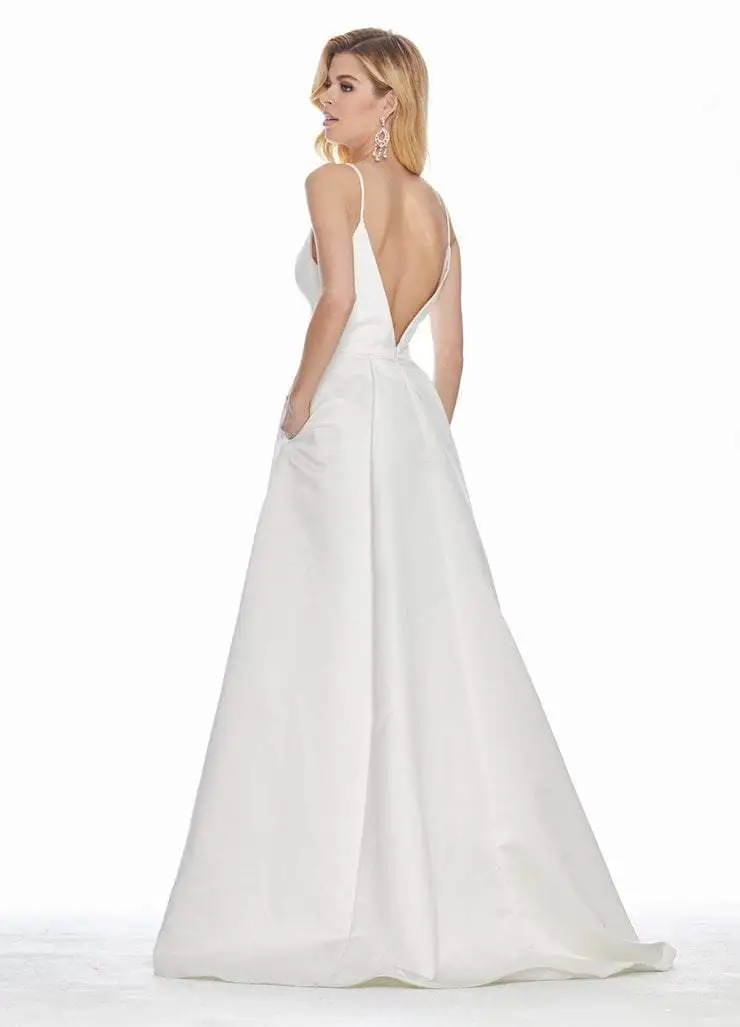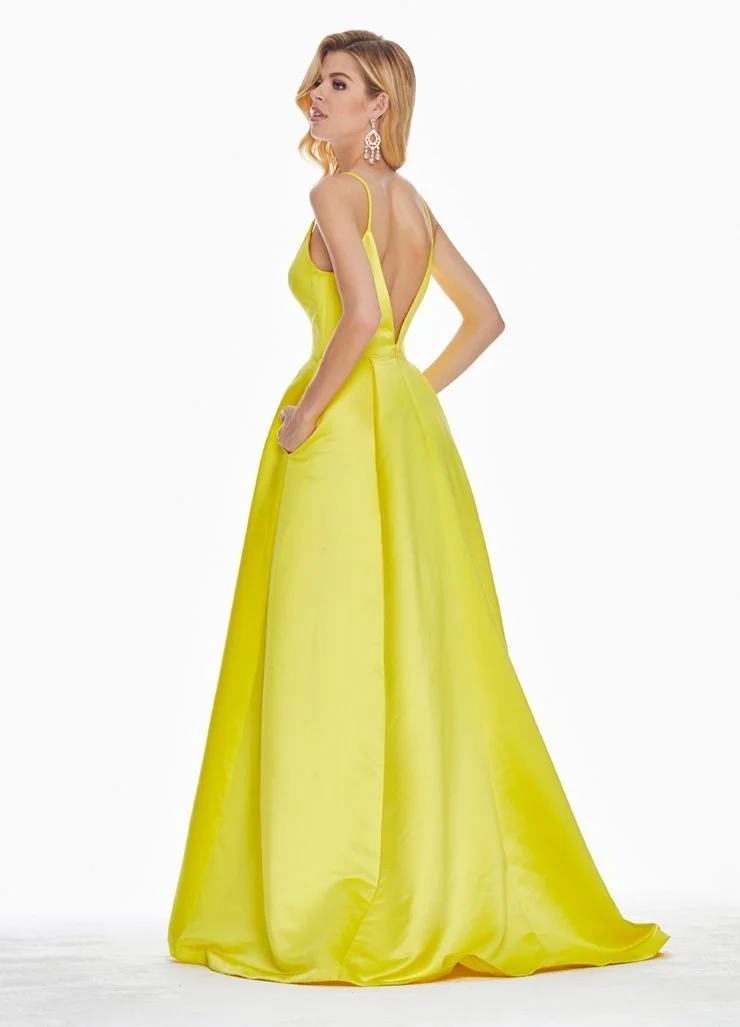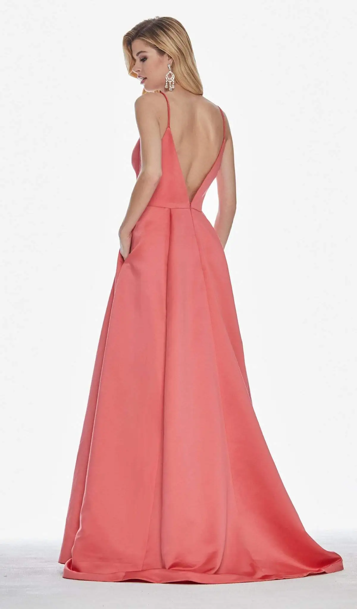 Make a grand entrance as you take their breath away with this stunning creation by Ashley Lauren 1384. A classy satin special occasion gown that features a deep V neckline with sheer panel, and princess seam lines that sculpts the fitted sleeveless bodice and is held by fine shoulder straps. The back flashes a low V-cut style with center zipper closure at the end. A full-length A-line skirt features pleats and side pockets, and is trimmed with folded hemline that finishes at floor length. Picture a night of eloquent style and poise at your black-tie event while wearing this charming Ashley Lauren gown.
