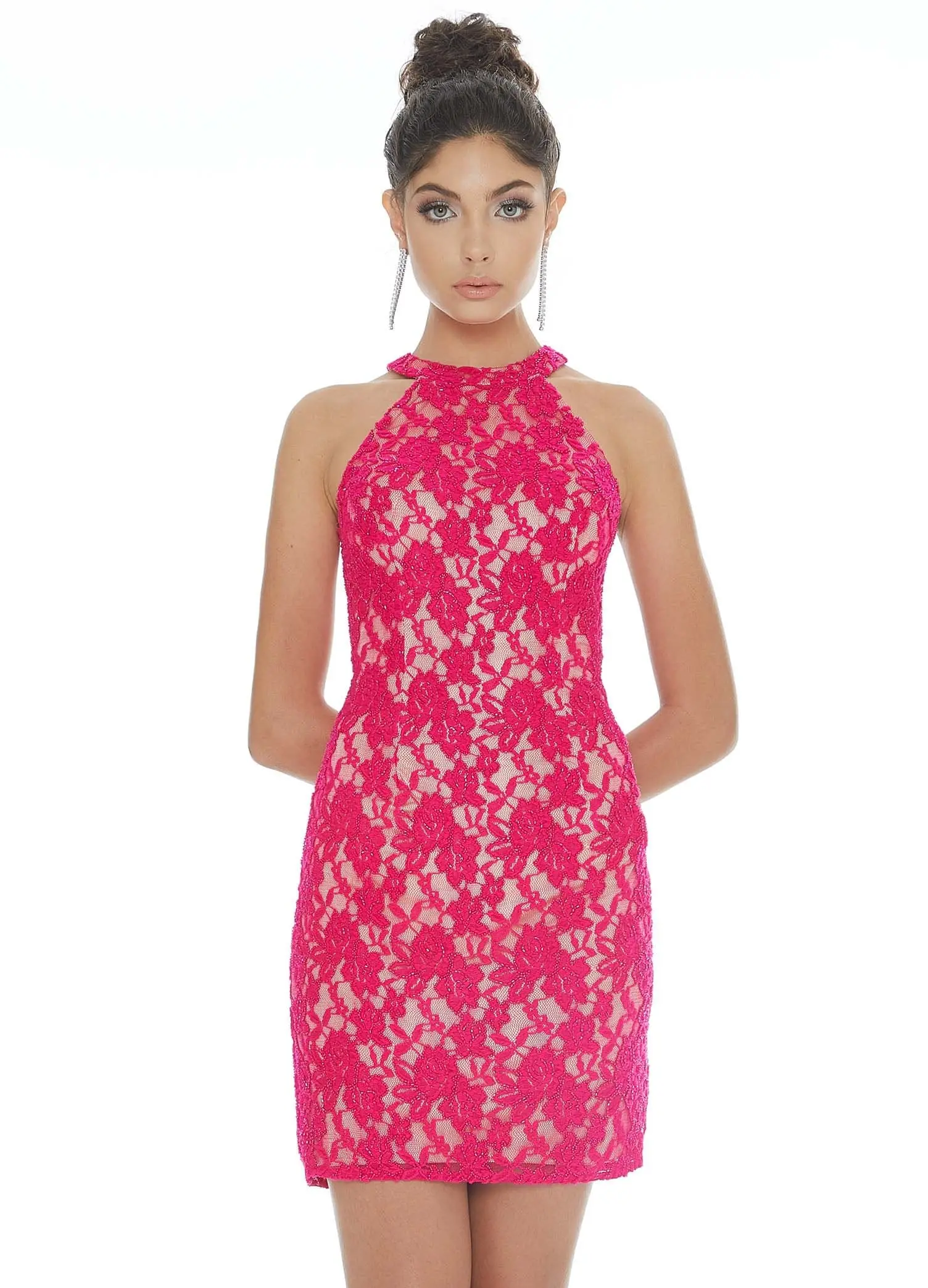 Dress to impress as you stand out in this Ashley Lauren 4292 creation. Draped with a hand beaded lace for that perfect fit, this dress shows a halter neckline. An open back strapped with a racerlike design with its adjustable straps. The short sheath silhouette forms a modern cut. Dazzle from head to toe in this Ashley Lauren masterpiece. Model is wearing the Fuchsia/Nude color.