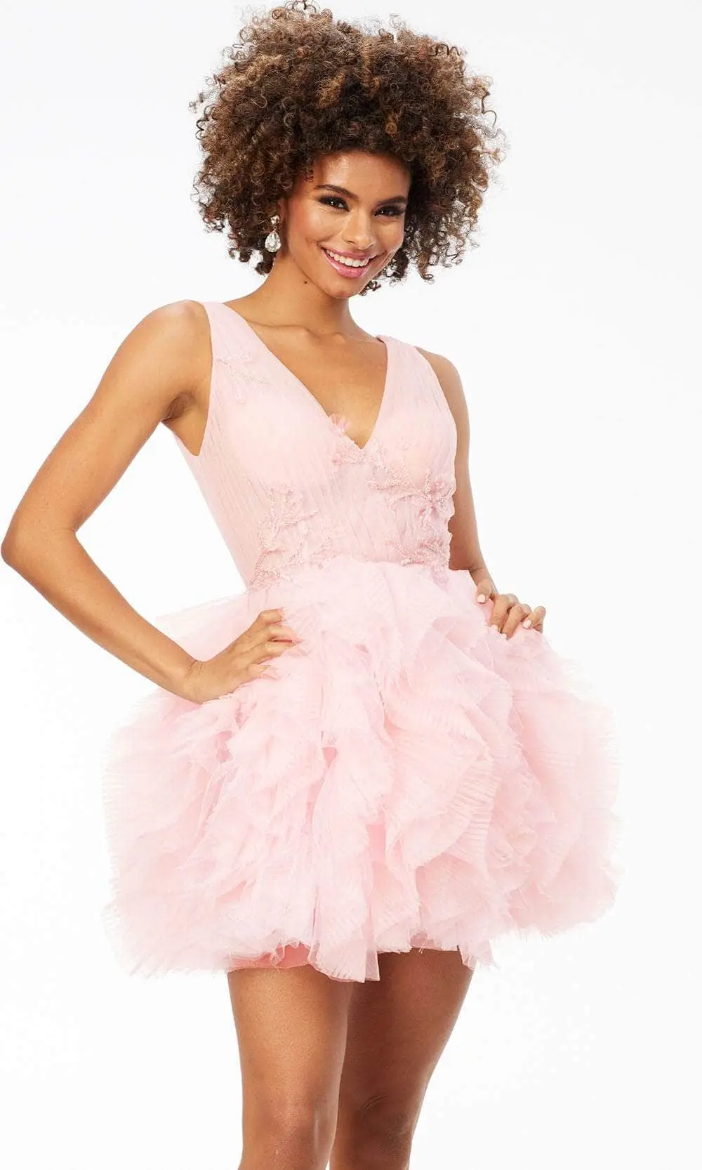 Look your absolute best and create a night that you will never forget in this Ashley Lauren 4546 creation The fitted sleeveless bodice is finished off well with a V-neck that is elegantly embellished with beaded embroidery. It has an open back with a zipper closing for a secure fit. The skirt’s fitted silhouette is lovely and welcoming, and it is highlighted with a tiers of ruffled tulle with a mid thigh hem. Fascinate the crowd wearing this exceptional Ashley Lauren masterpiece. Models are wearing Blush, Orchid, and Black/White colors.