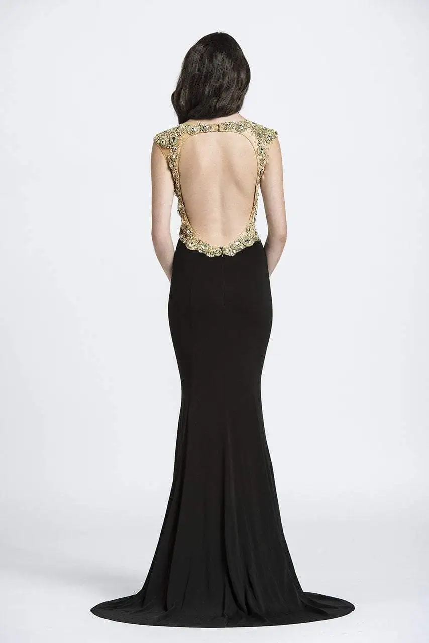 | Details: | Plunging neckline, Cap sleeves, Sheer fabric, Beading, Jersey, Illusion bodice, Open back, Back zipper, Sheath skirt, Sweep train |