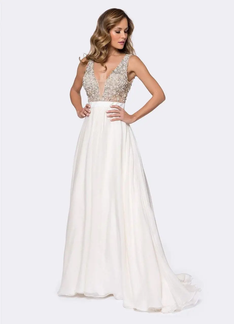 | Details: | Sleeveless, Plunging neckline, Sheer inset, Beaded bodice, Crystal and pearl beading, Deep V-back, Back zipper, Sweep train |