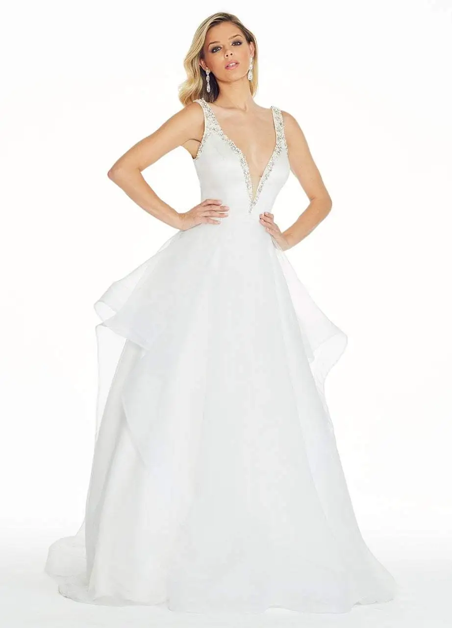 Make an entrance in this beaded silk organza bridal dress by Ashley Lauren 1292. The illusion V-Neckline bustier is adorned with pearl and rhinestone beading that continues to the back. The A-Line skirt is made from layers of silk organza. This Ashley Lauren evening gown will not let anyone miss your grand entrance.