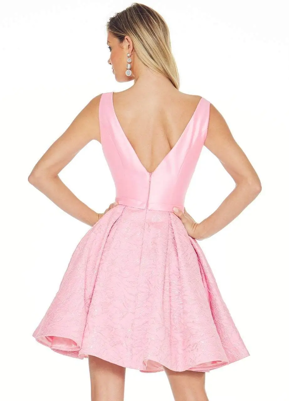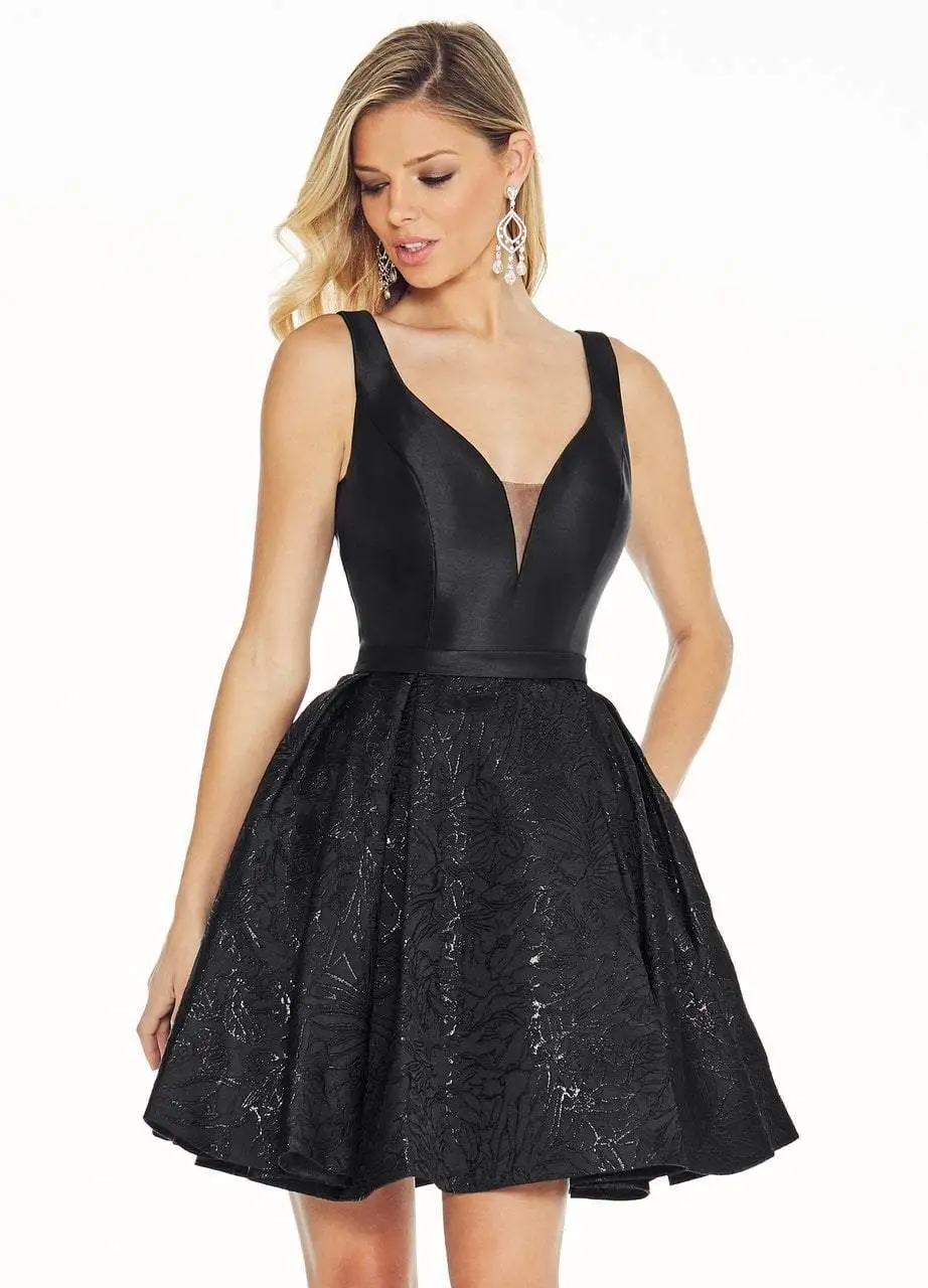 Look fun and flirty in this cocktail dress by Ashley Lauren 4065. Wows the crowd in a sleeveless, plunging V-neckline with sheer inset. This Mikado dress is wrapped in a thin belt and is styled with a low V-back and a zipper closure. Metallic embellishments accent the brocade A-line skirt and is designed with pockets for convenience. This Ashley Lauren piece is sure to be both comfy and fashionable.