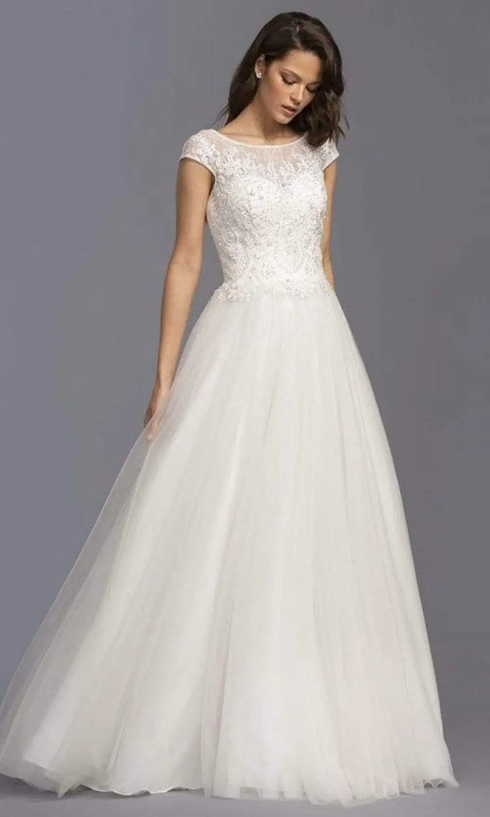Take your seat on the throne in this queenly Aspeed Bridal L2249 gown. This bridal gown is so beautiful as it features a bateau illusion neckline and a cap sleeves. It is made with a lace applique design and a beads. The skirt is made with organza fabric and it is a sweep train skirt. It is a floor length dress that make your every walk to aisle mesmerizing. It has a v-back to show some skin for an alluring look. Zipper is added on the back just enough for closure. This Aspeed Bridal design is ideal for the bride who wants to exude classic sophistication while living out her modern-day fairytale.