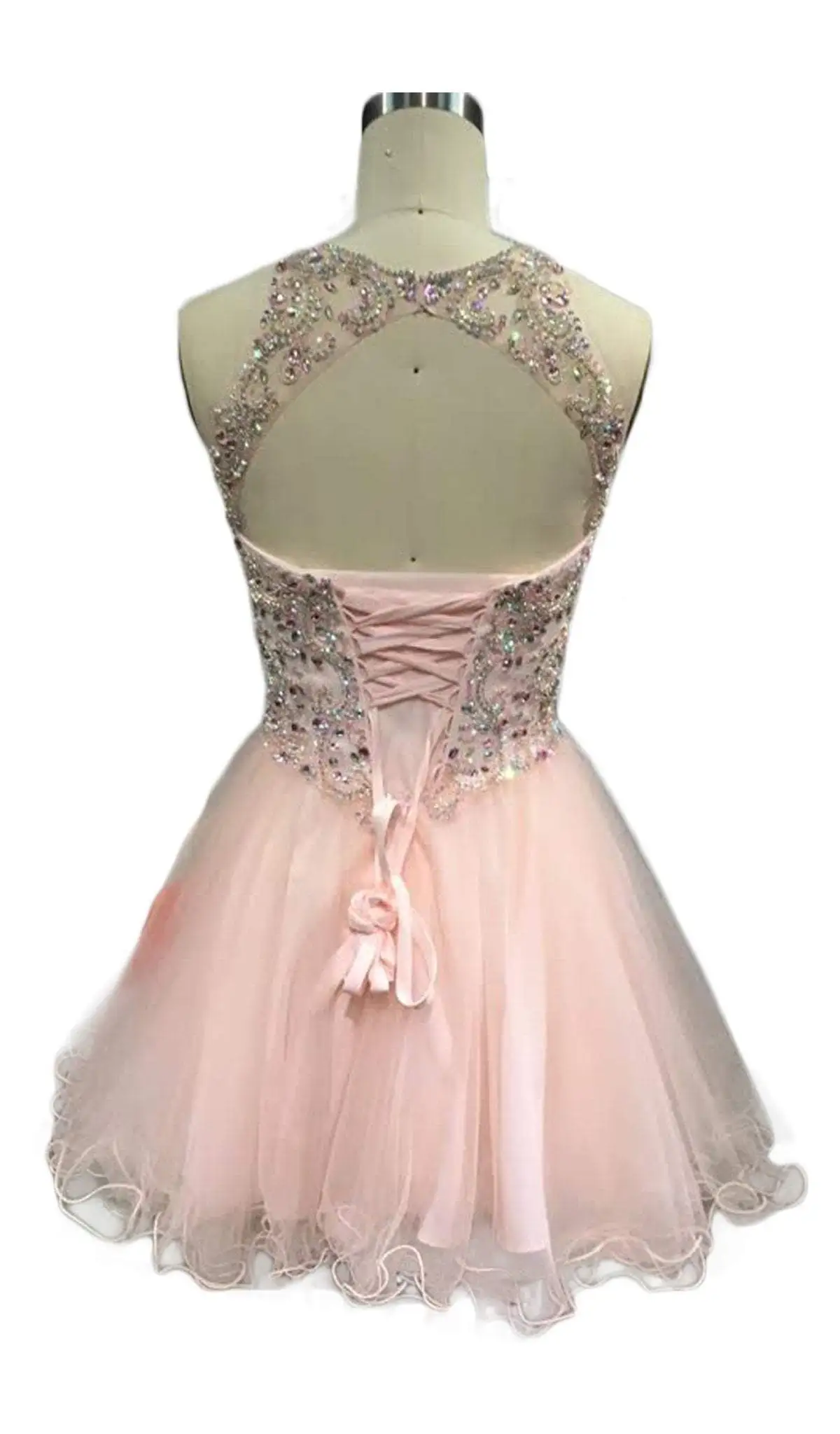 | Details: | Sleeveless, Embellishments, Fitted bodice, A-line skirt, Curled hem, Open back, Lace up closure |