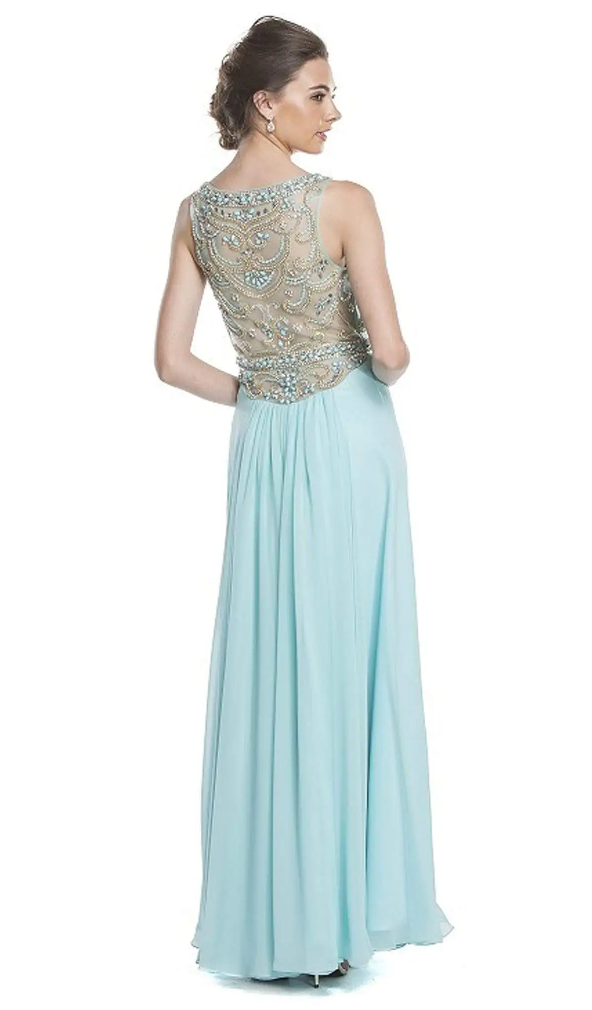 Look sophisticated and classy with this marvelous Aspeed Design L1611 evening dress. An illusion bateau neckline crowns the fitted and sleeveless bodice beautifully embellished with sparkling crystals in swirling patterns. An A-line skirt flares with pleating to a full length hemline. Enjoy a carefree evening in this lovely Aspeed Design evening dress.