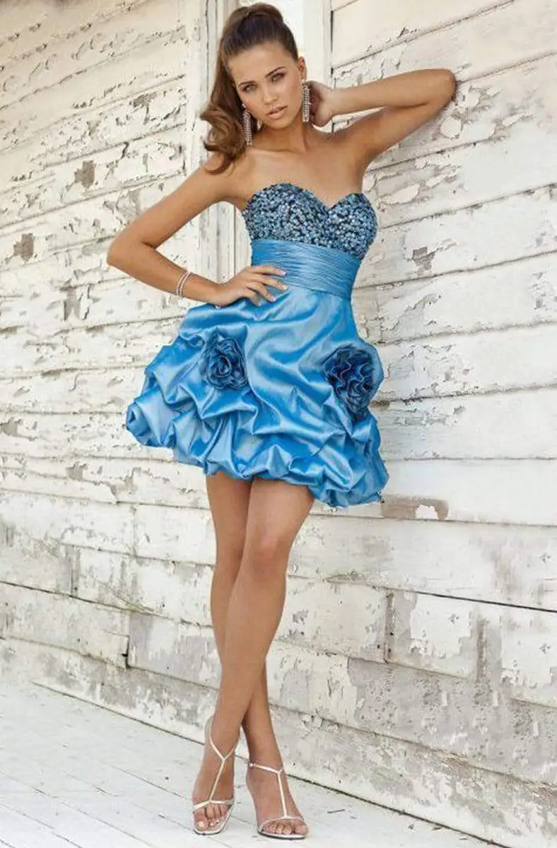 | Details: | Sequins, Beads, Strapless, Wide Pleated Waistband, Rosette Skirt Accents, Ruffled Balloon Skirt Short Hem, Beaded Taffeta |