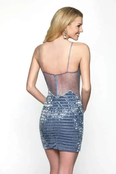 Have them gaze at you with fascination when you steal the spotlight in this Blush Black B107 creation. Beautifully textured with ribbed details shimmering with rhinestones, this stunner shows a straight-across neckline supported with embellished spaghetti straps. Glimmering with heat-set stones, the illusion back reveals a zigzagged treatment that creates interest. The sheath skirt glistens as it curves down to a short hemline. Look exquisitely alluring in this magnificently ornate Blush masterpiece. Model is wearing the Slate Blue/Silver color.