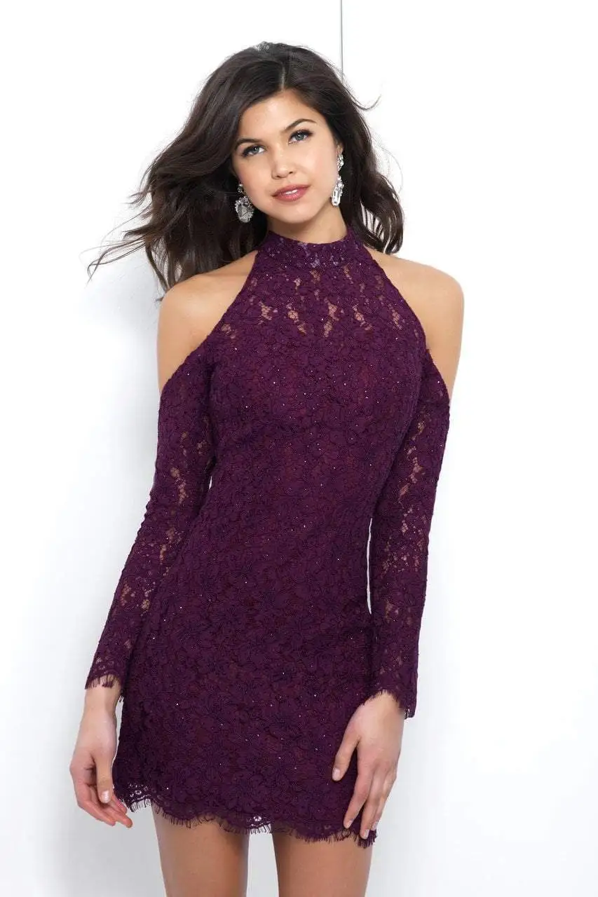Wow everyone in this sophisticated cocktail dress by Blush C418. This dazzling form-fitting dress is wrapped in an embroidered stretch lace. The bodice features high neckline and long sleeves with cold shoulder detail. Keyhole cutout on the back and dainty scalloped hem add dramatic touch to the ensemble. The skirt is fitted and finishes with a scalloped mini hemline. Another great creation by Blush! Model is wearing a Sangria color.