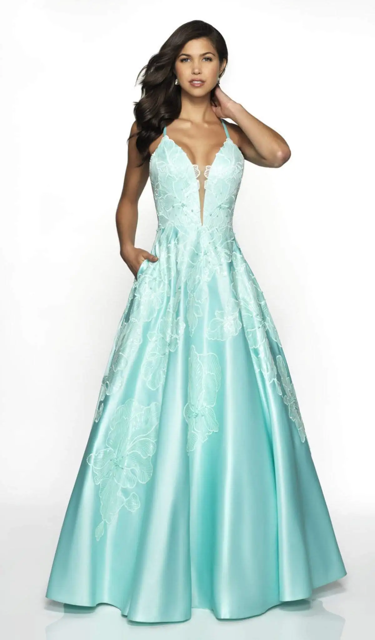 | Details: | Sleeveless, Spaghetti Straps, Rhinestones, Illusion Modesty Inset, Floral Lace Appliques, Inseam Pockets, Mid-Open Back, Back Zipper Closure, Full Length Hem |