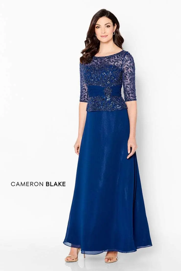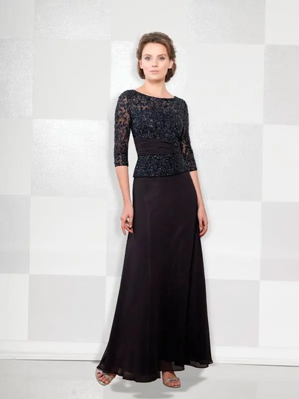 Chiffon mock two-piece A-line dress with hand-beaded three-quarter sleeves, bateau neck beaded illusion over a sweetheart bodice with ruched chiffon midriff accented with side beaded motif, suitable for wedding guests, formal events and cocktail parties. Matching shawl included. Also available with cap sleeves as 114657.