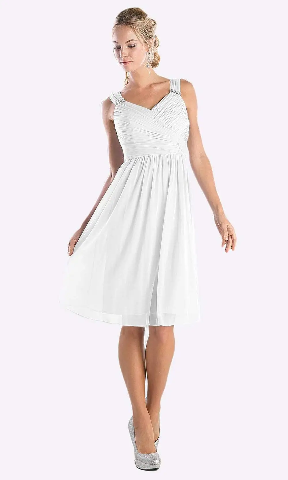 Portray a vision of loveliness in this classy piece by Cinderella Divine 3802. This flowy chiffon short dress charms in a sleeveless bodice textured with fine pleats, showcasing a V neckline with metal clasp accenting the shoulder straps. The dress flourishes with a classy A-line silhouette that finishes at the knee length. Keep it simple and sophisticated with this refined style by Cinderella Divine.