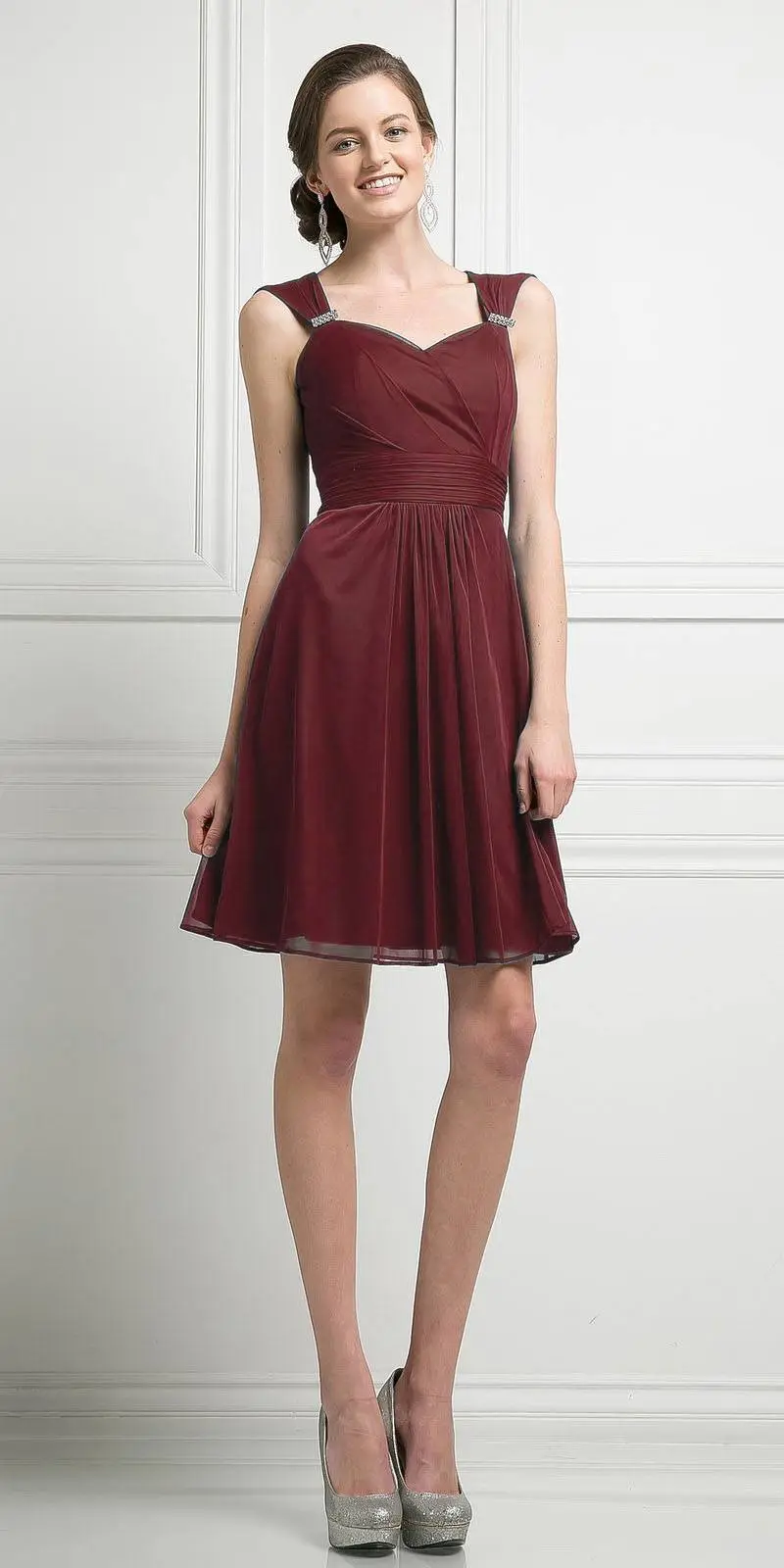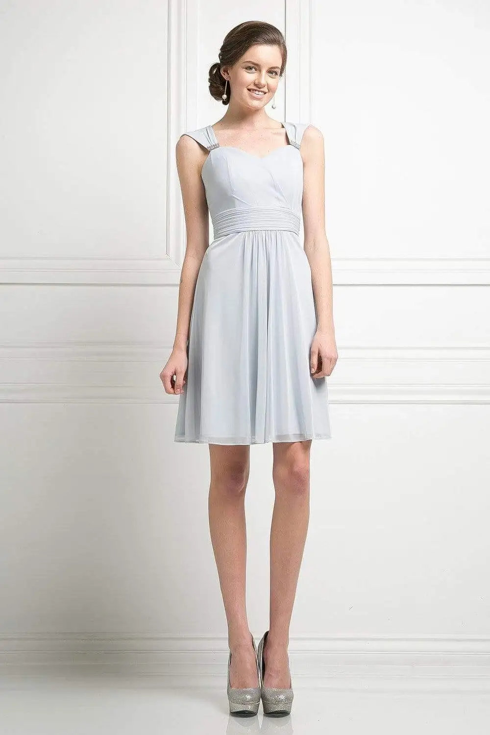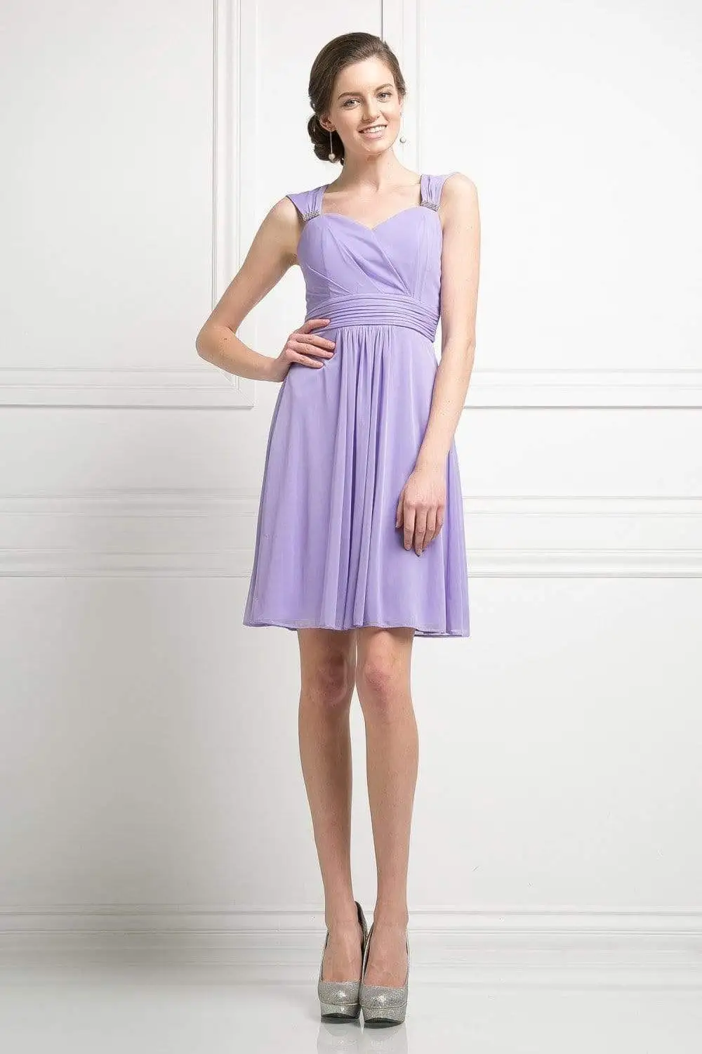 Strike a pose in this fashionable and fun, classy inspired short cocktail dress from Cinderella Divine 3832. The dress charms in soft chiffon fabric, features a semi-sweetheart neckline with wide beaded accent shoulder straps, fine asymmetric pleats on the front bodice and ruched empire waistband. The back reveals ruched details with wide shoulder frame and cutout at the center. The softly gathered chiffon skirt flares and finishes at above-the-knee-length. Look fresh and pretty while having fun in this semi-formal party dress by Cinderella Divine.