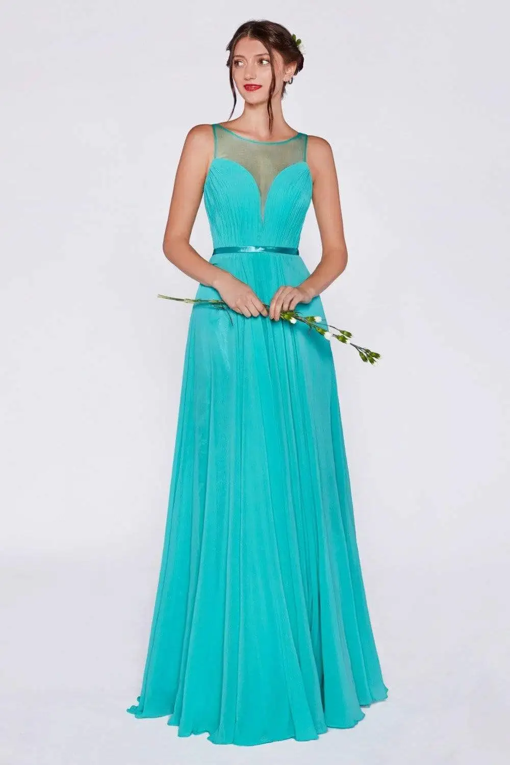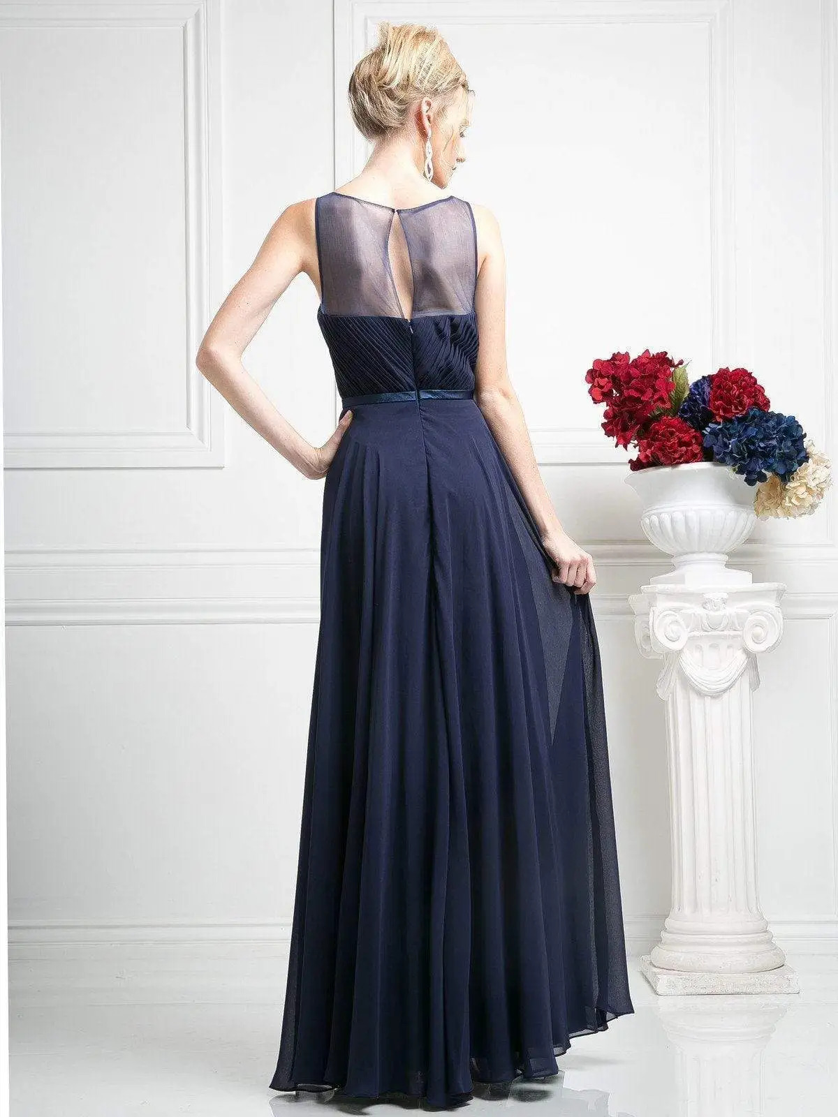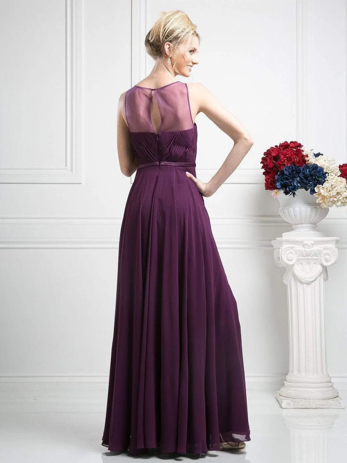 Capture pure elegance in this classy illusion yoke evening gown from Cinderella Divine 7458. Elegantly fabric in luxe chiffon, this A-line gown features a sheer scoop neckline and a sweetheart shaped bustier with deep center panel, and fine ruched details on the bodice. The back reveals a keyhole cutout, while the midriff is fitted from the empire waist, with a tonal belt cinched at the natural waistline. The finely pleated chiffon skirt draws a full-length flowy finish to the floor. This Cinderella Divine creation is sure to bring you an unforgettable romantic moment on your next special event.