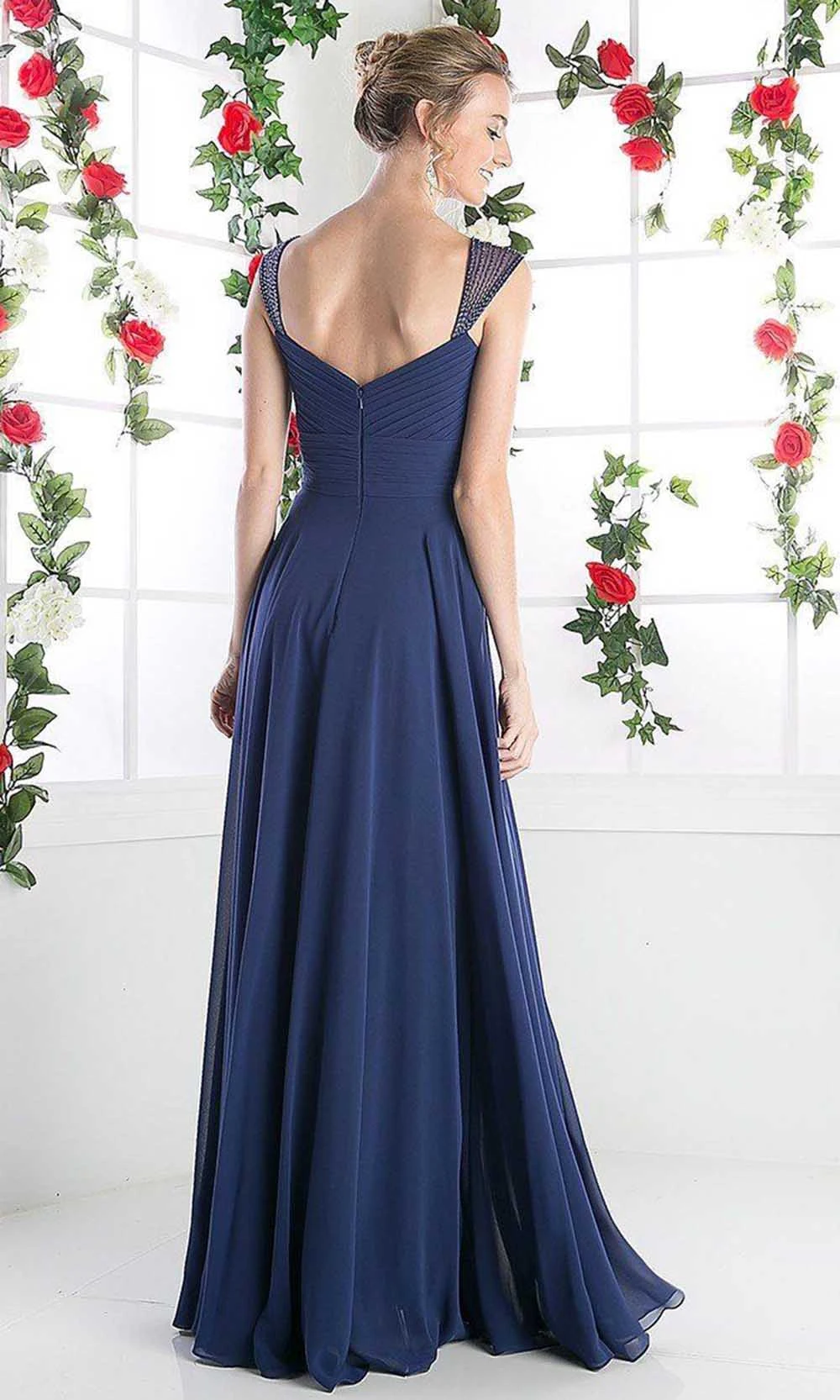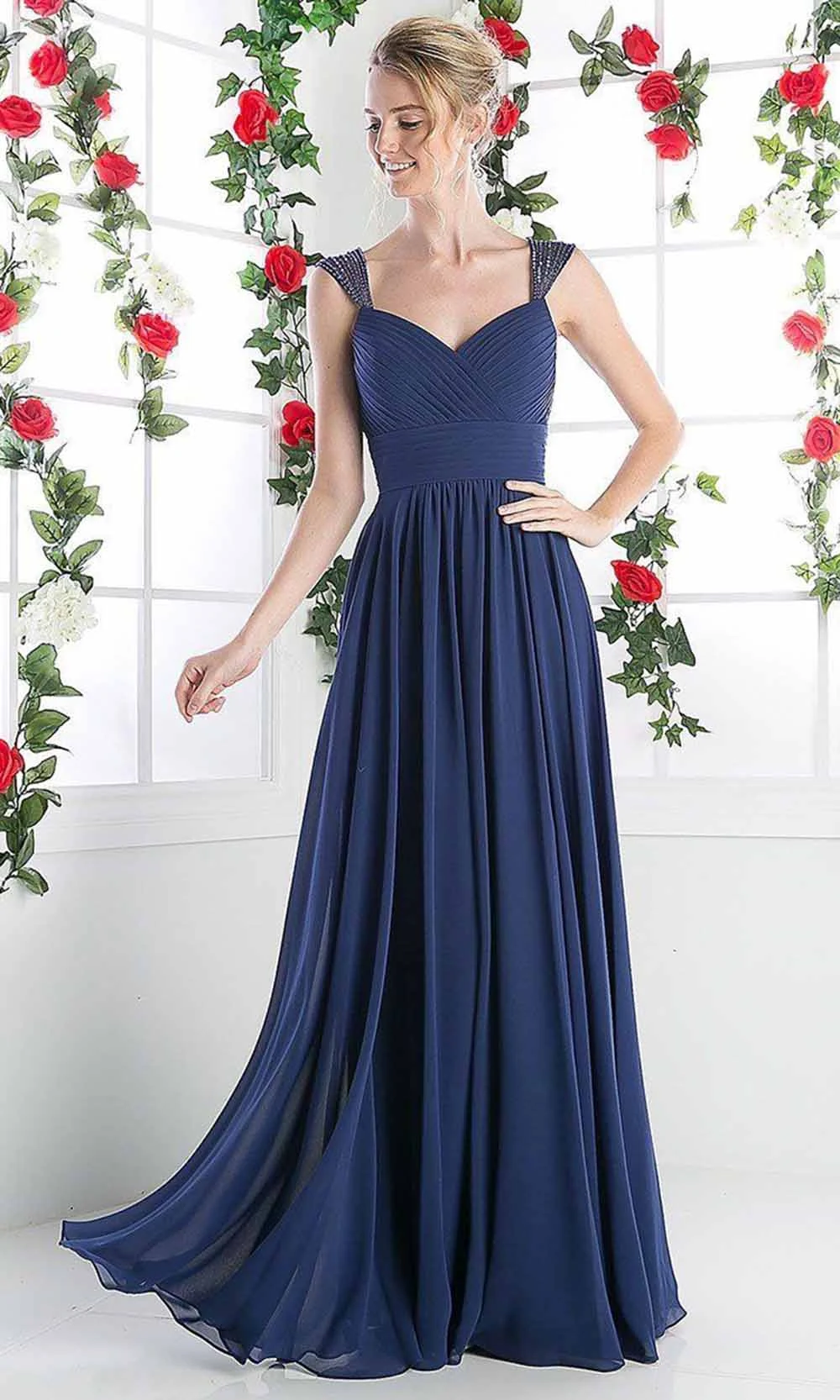 Bring a charming new look in this lovely Cinderella Divine 7461. This dazzling solid chiffon gown shows off a sleeveless sweetheart neckline and a fitted bodice elegantly structured with fine pleats that tops the ruched wide empire waist while the shoulders are embellished with beaded sheer straps. The finely gathered skirt flourishes in an elegant flowy A-line silhouette and finishes to full-length hem. An elegant choice for a romantic Prom, Gala or as Bridesmaid gown, this Cinderella Divine style is immaculate!