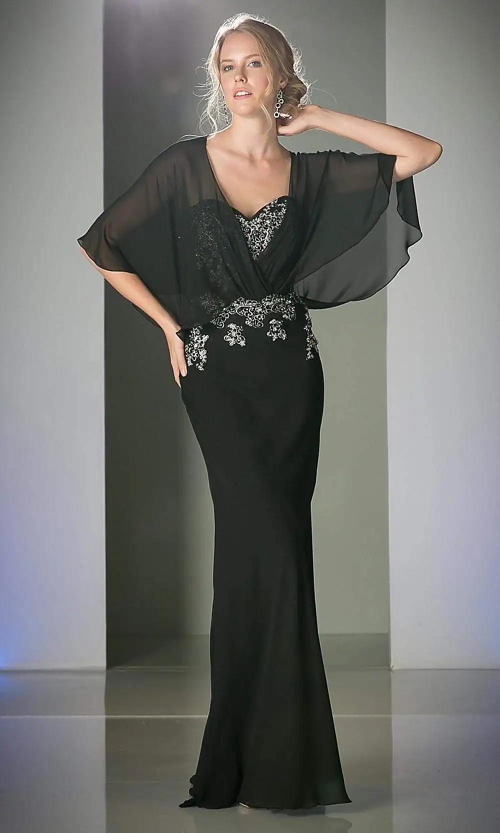 | Details: | Chiffon, Beaded Lace appliques, Sheer Capelet, Full-length, Hidden Back zipper with hook and eye, Sweep train |