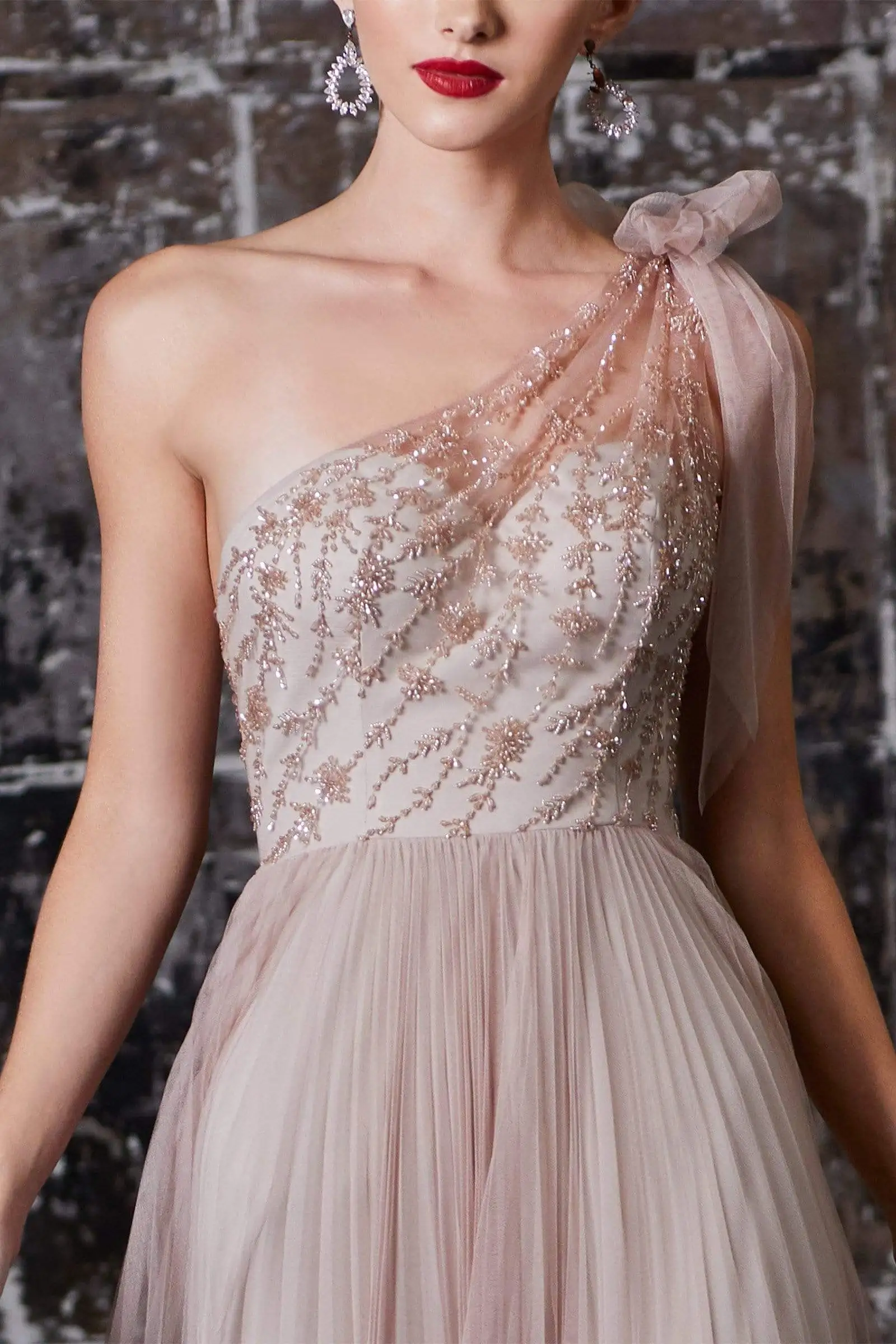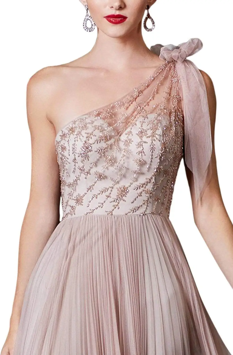 | Details: | Sleeveless, Sweetheart lining, Fitted bodice, Beading, One shoulder, Back zipper, Pleated A-line skirt |