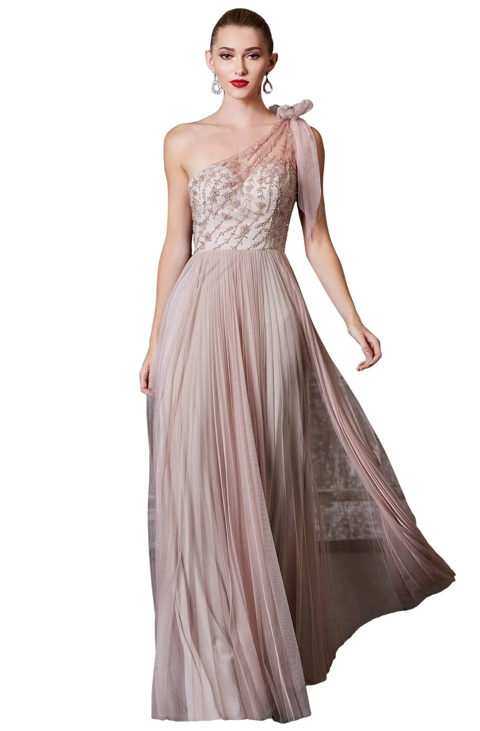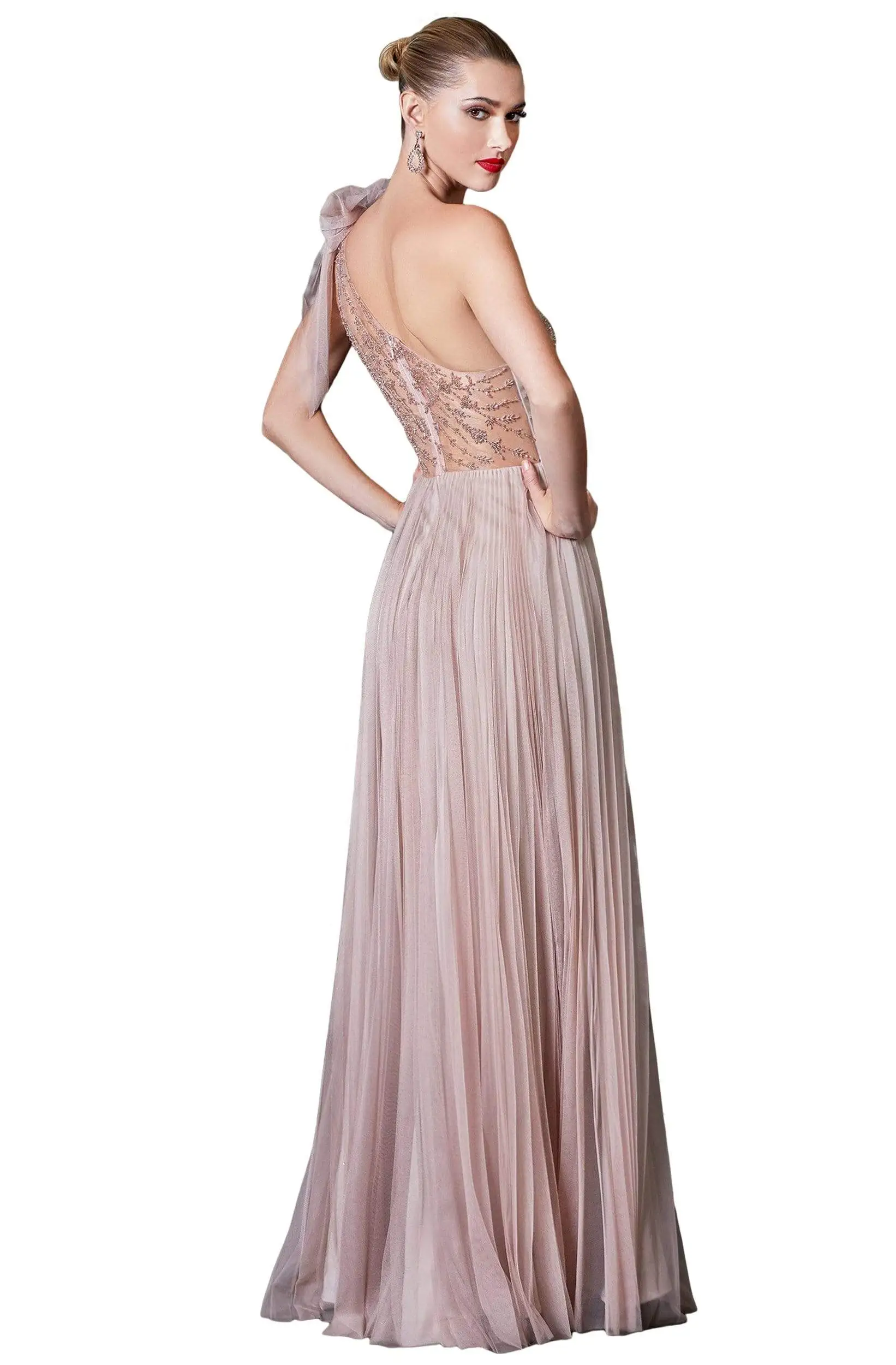 Flatter your finest assets as you enthrall the crowd in this design by Cinderella Divine CD169. Makes a statement in a sleeveless, asymmetric neckline with a sweetheart lined bodice and a one shoulder detail. The dress is adorned with beading and from the waist flourishes a full length pleated A-line skirt. Be in this gorgeous Cinderella Divine creation and leave a lasting impression.